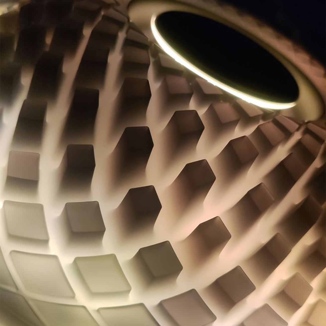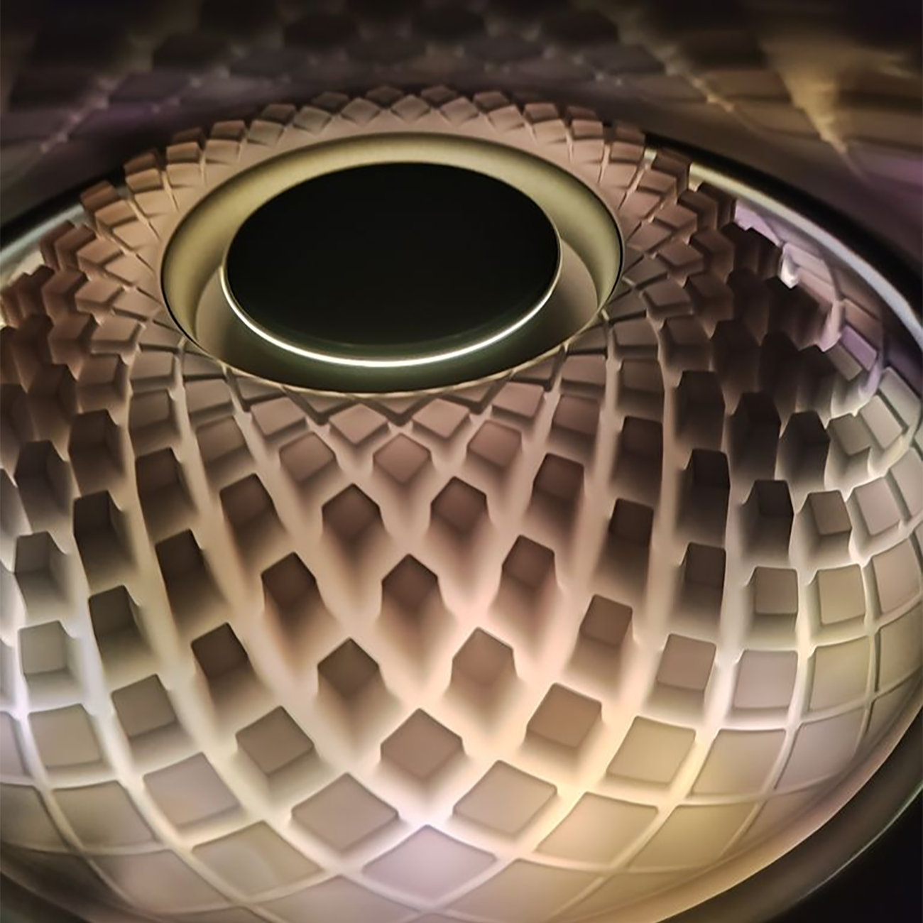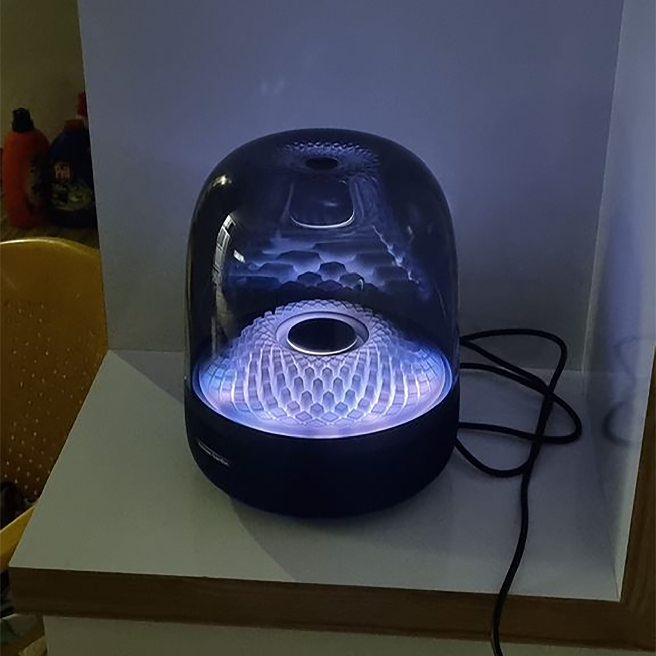 طراحی Aura Studio 4 از همان نگاه اول، حضوری فراتر از یک اسپیکر معمولی دارد. بدنه شفاف و کریستالی آن از پلاستیک مقاوم ساخته شده که نور را با ظرافتی چشمگیر منعکس میکند و حالوهوای مجسمههای مدرن را به فضای داخلی میبخشد. فرم گنبدی و خطوط منحنی این محصول، اصالت و فناوری را همزمان به نمایش میگذارد. با وزن ۳.۶ کیلوگرم و ابعاد ۲۸۳.۶×۲۳۲×۲۳۲ میلیمتر، این اسپیکر نه تنها در عملکرد، بلکه در زیباییشناسی نیز به نقطه کانونی هر فضا تبدیل میشود.
