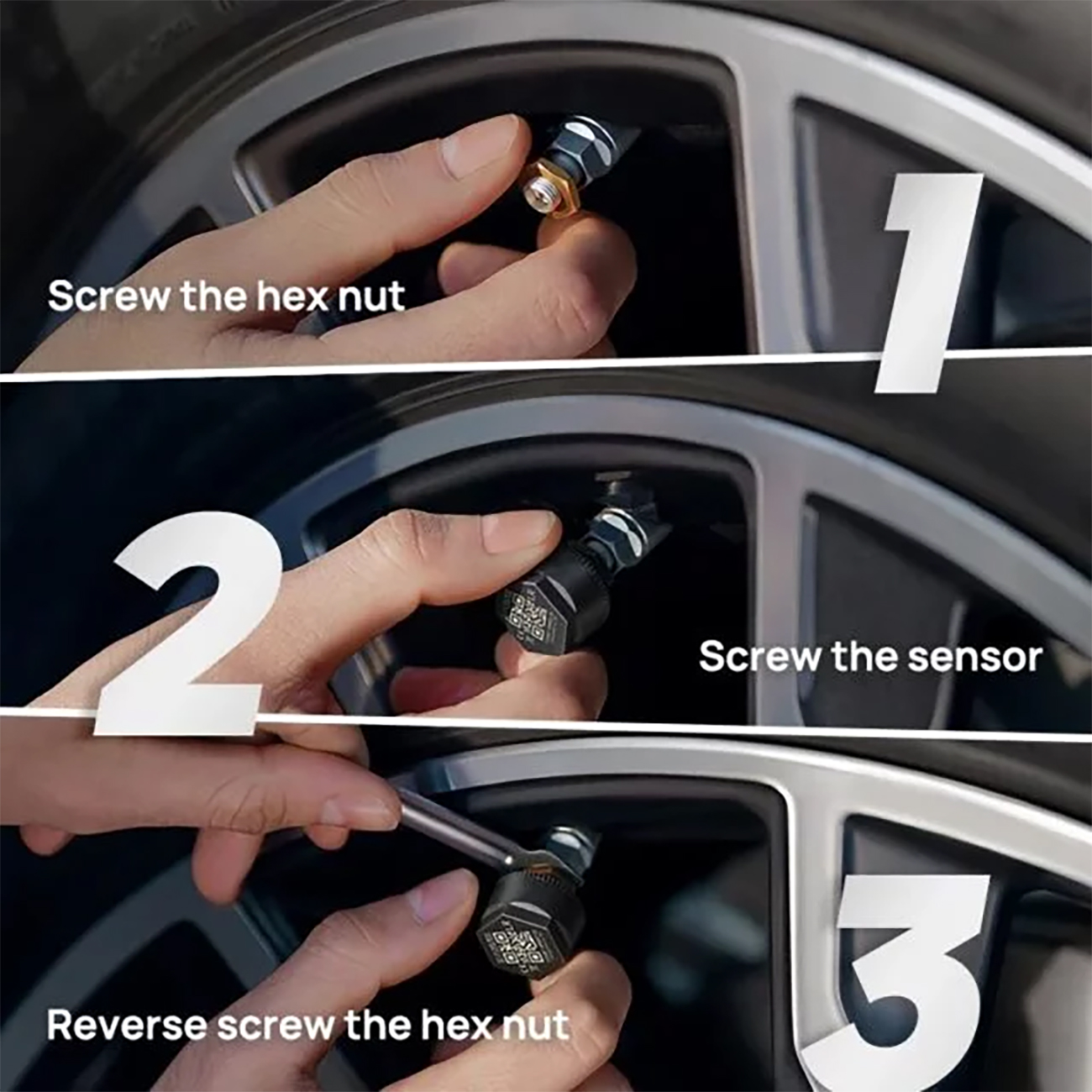 سنسور را با استفاده از آچار کوچک موجود در بستهبندی روی والو لاستیک (جلو چپ، جلو راست، عقب چپ، عقب راست) محکم کنید. هر سنسور برچسب مشخصی دارد که جایگاه آن را نشان میدهد.