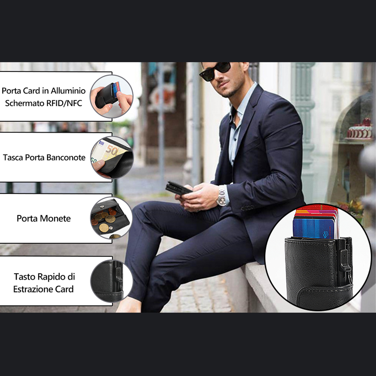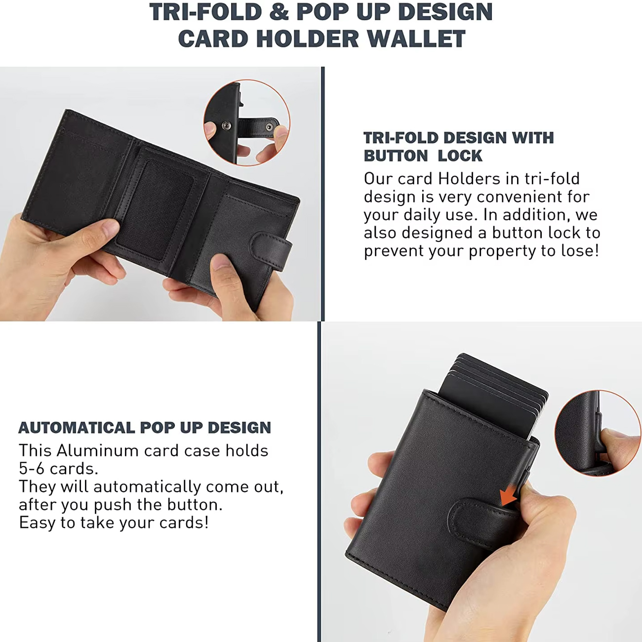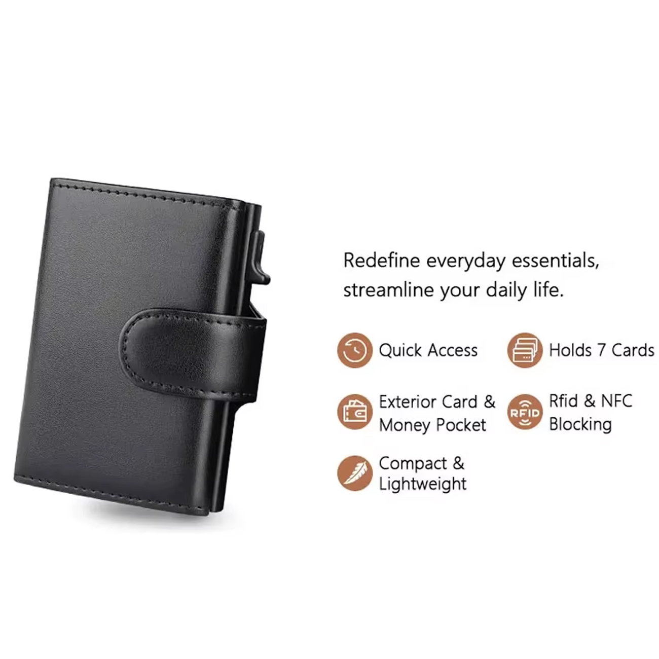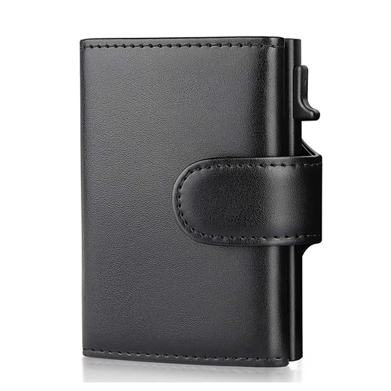 قاب آلومینیومی داخلی ظرفیت 5 تا 6 کارت را دارد و با فشردن دکمهٔ جانبی، سیستم پاپآپ کارتها را به ترتیب بیرون میآورد. این قابلیت زمان خارج کردن کارت در پرداخت یا ورود به اماکن را بهطور چشمگیری کاهش میدهد. آلومینیوم بهخاطر سبکی و استحکام، توازنی مناسب بین دوام و راحتی حمل ایجاد کرده و طراحی مکانیزم طوری اجرا شده که از گیر کردن کارتها جلوگیری کند و عملکردی روان ارائه دهد.