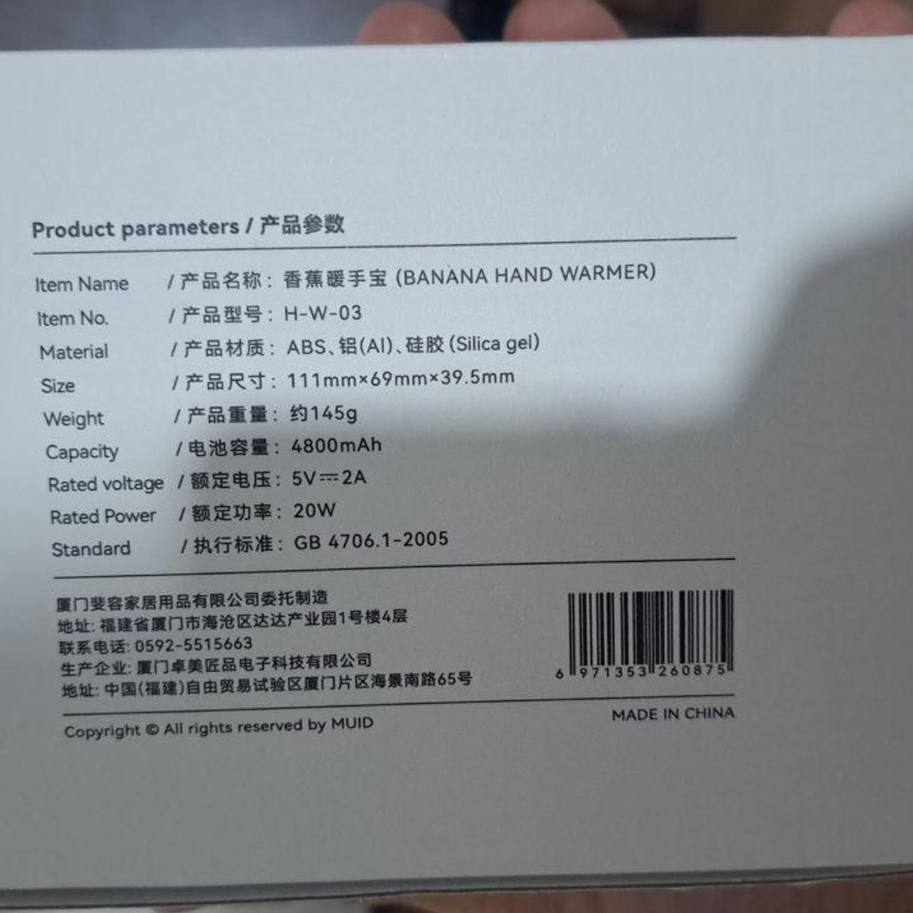 گرمکن دست H-W-03 از پلاستیک ABS، سیلیکاژل نرم و آلیاژ آلومینیوم ساخته شده که ترکیبی از استحکام و نرمی را ارائه میدهد. طراحی شبیه موز با خطوط صاف و منحنی، نه تنها ظاهری فانتزی و دلنشین دارد، بلکه بهخوبی در دست جا میگیرد و حس خوشایندی هنگام استفاده ایجاد میکند.