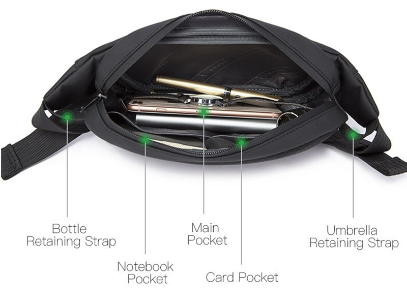 بند نگهدارنده چتر و بطری آب در کنارههای کیف هم دسترسی سریع به این موارد را فراهم میکند، بدون اینکه نیاز باشد محتویات کیف را بههم بریزید. یک جیب مخفی ضدسرقت در پشت کیف نیز برای نگهداری اقلام باارزش مثل کارت یا گوشی تعبیه شده است.