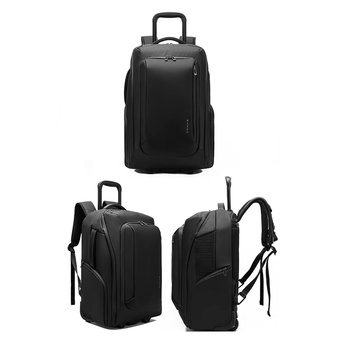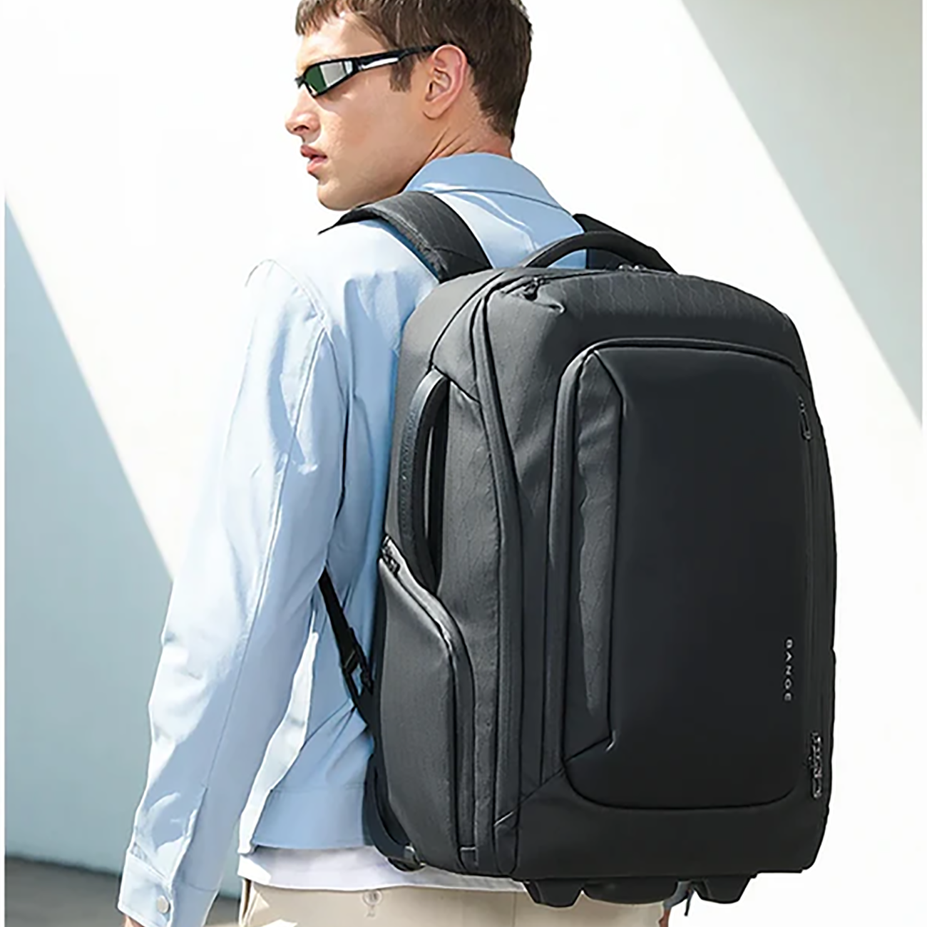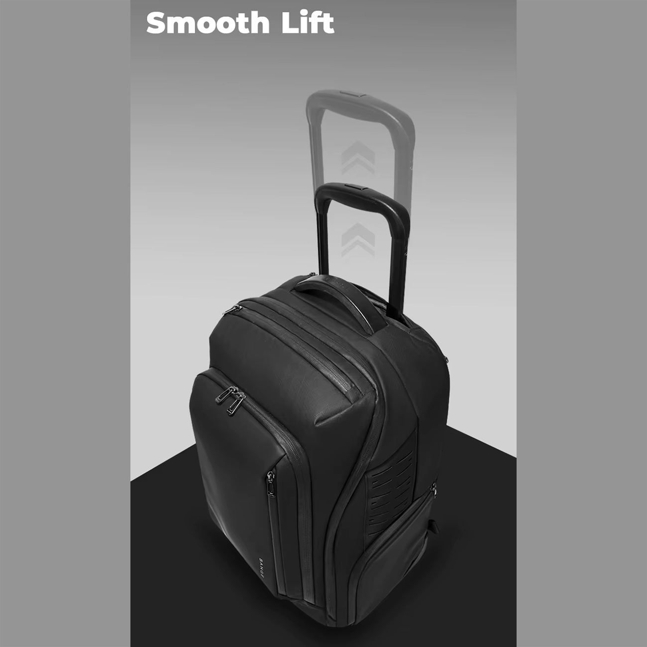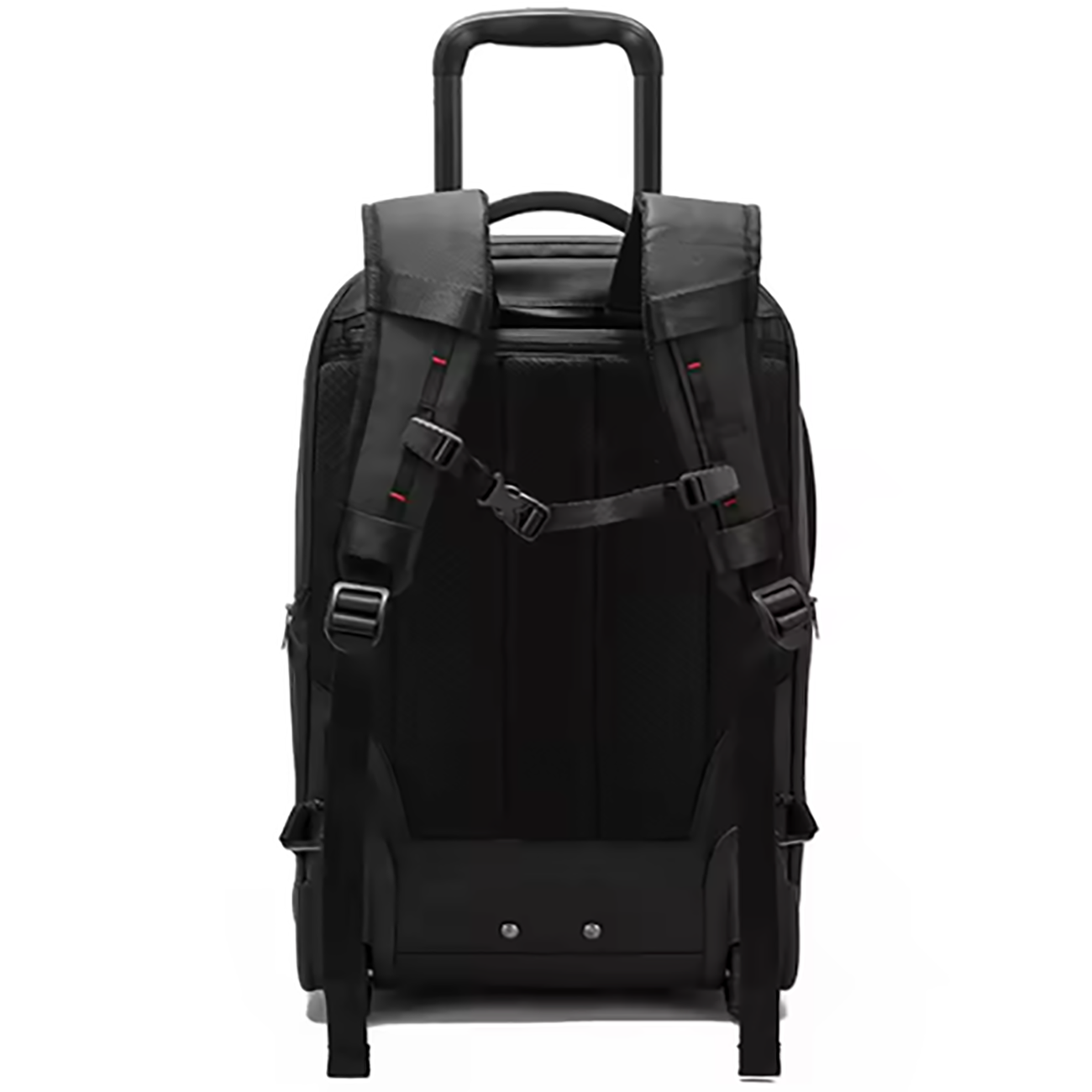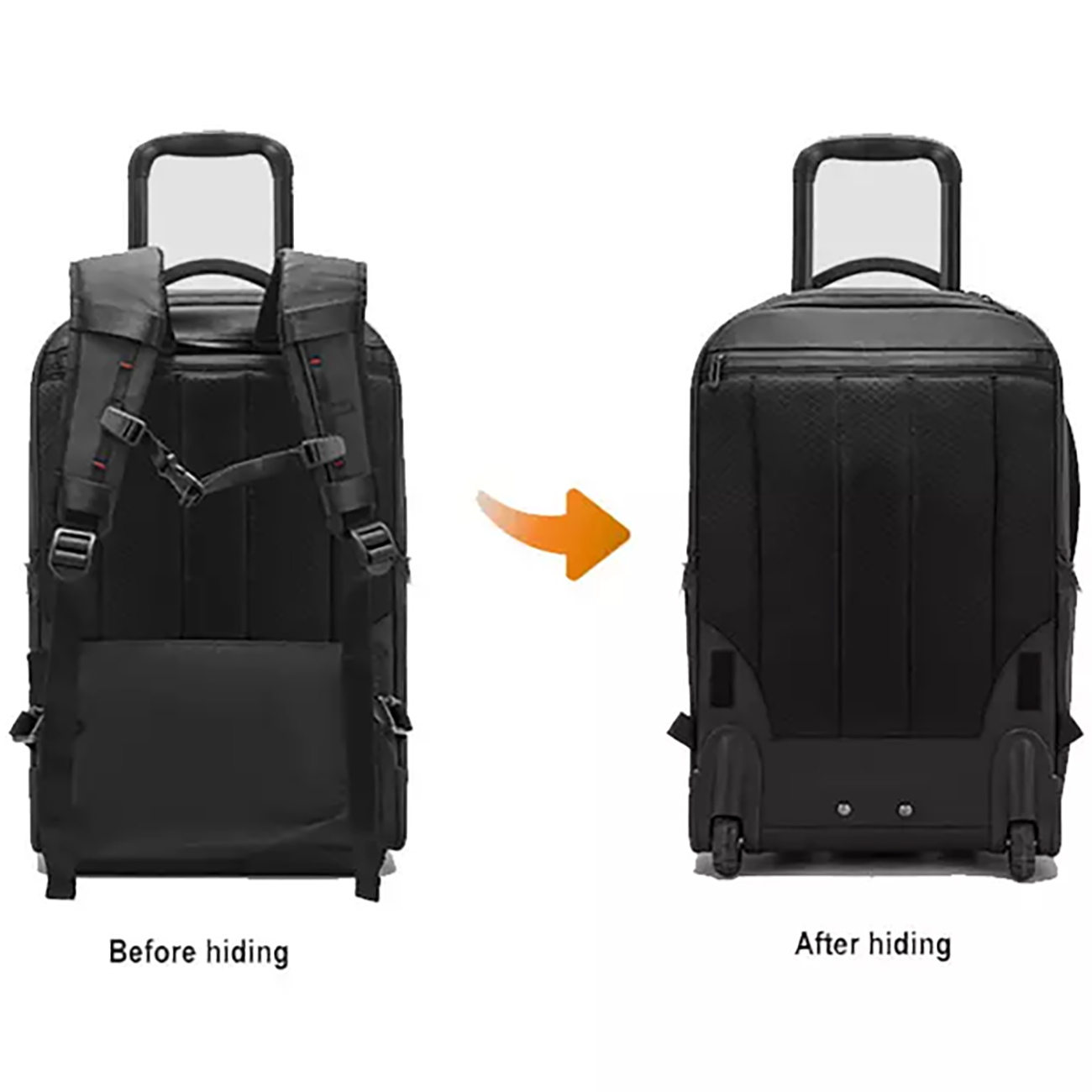 حالت چمدان چرخدار: برای فرودگاه، پیادهرویهای طولانی شهری یا حمل راحت. دارای دسته تلسکوپی قابل تنظیم ارتفاع و چرخهای ۳۶۰ درجه روان و بادوام.