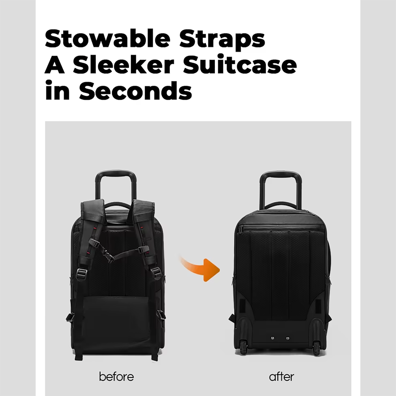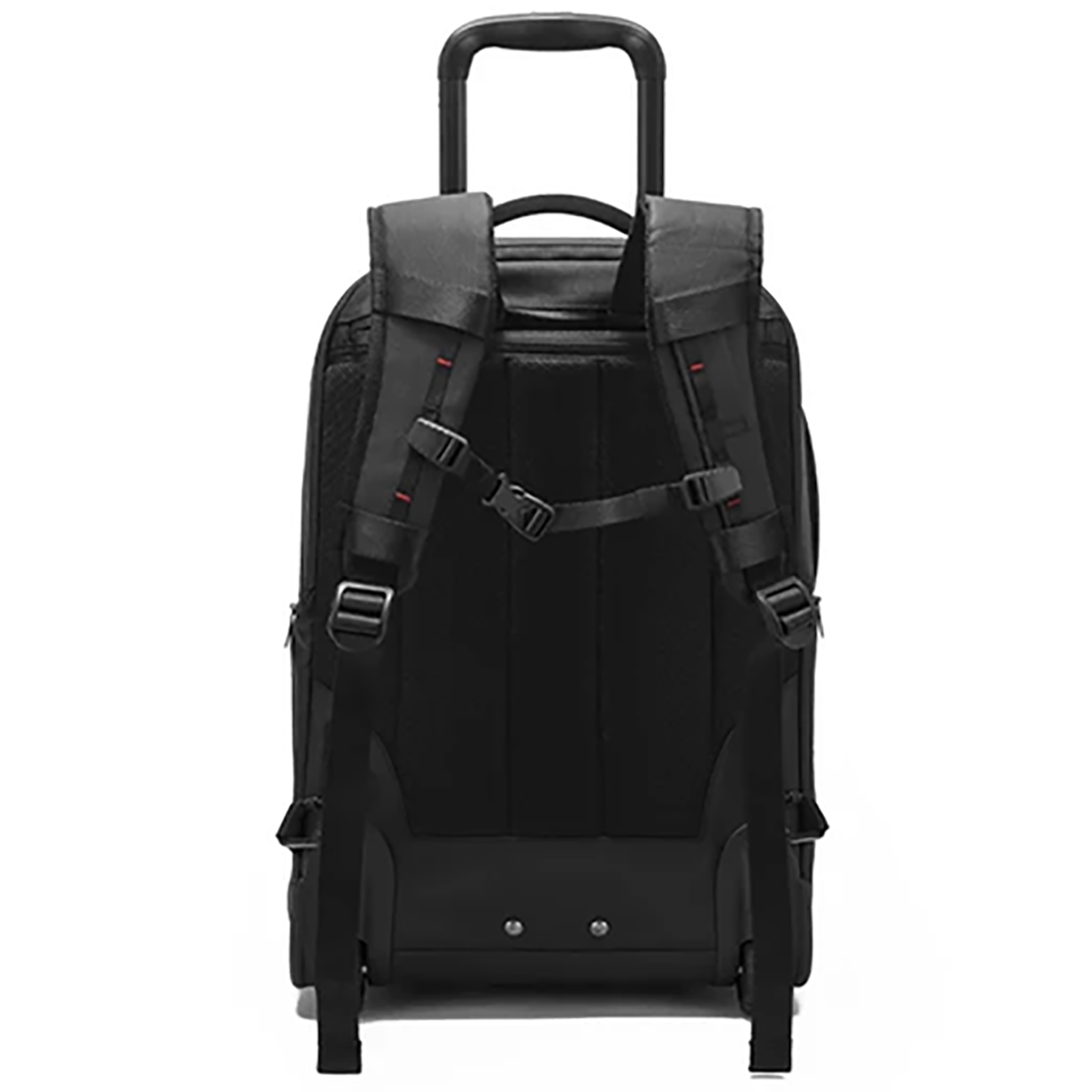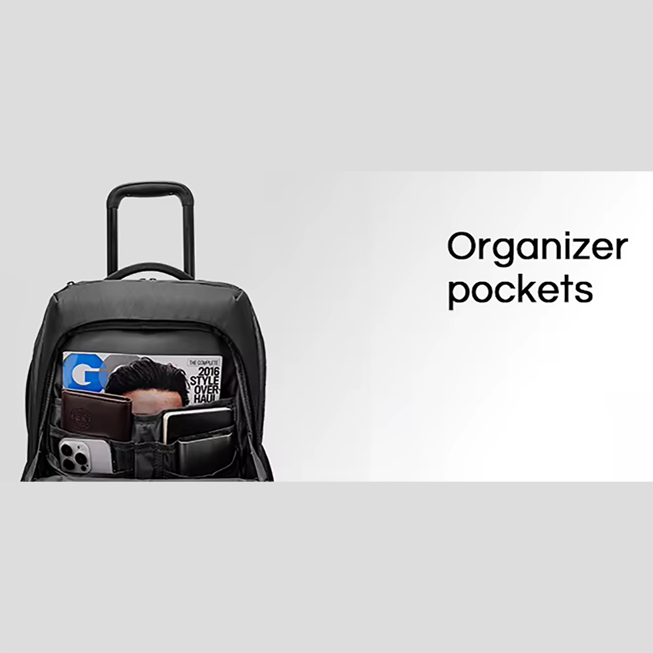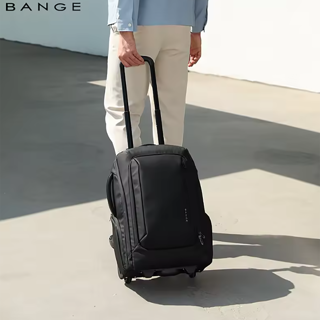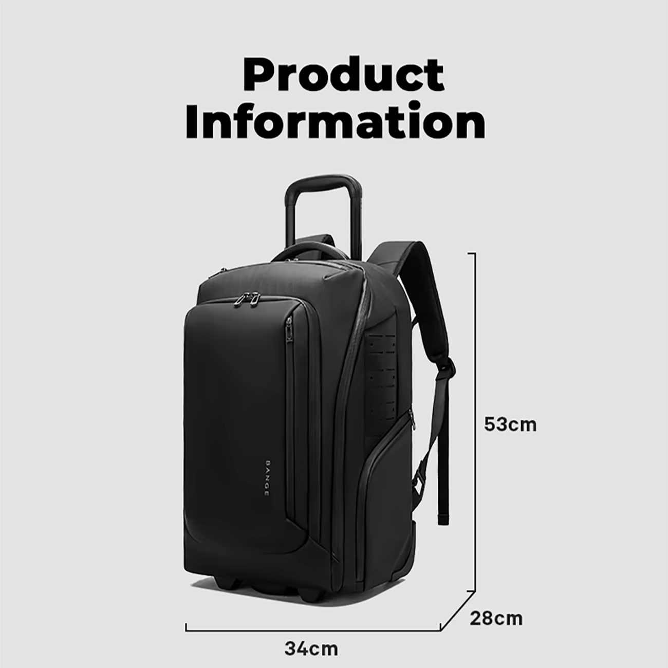 حالت چمدان چرخدار: برای فرودگاه، پیادهرویهای طولانی شهری یا حمل راحت. دارای دسته تلسکوپی قابل تنظیم ارتفاع و چرخهای ۳۶۰ درجه روان و بادوام.