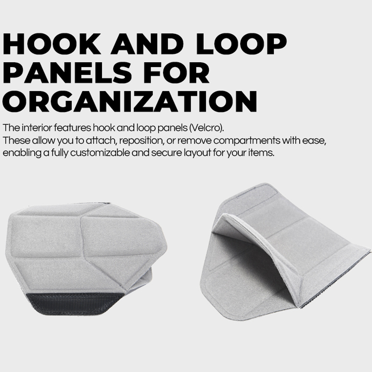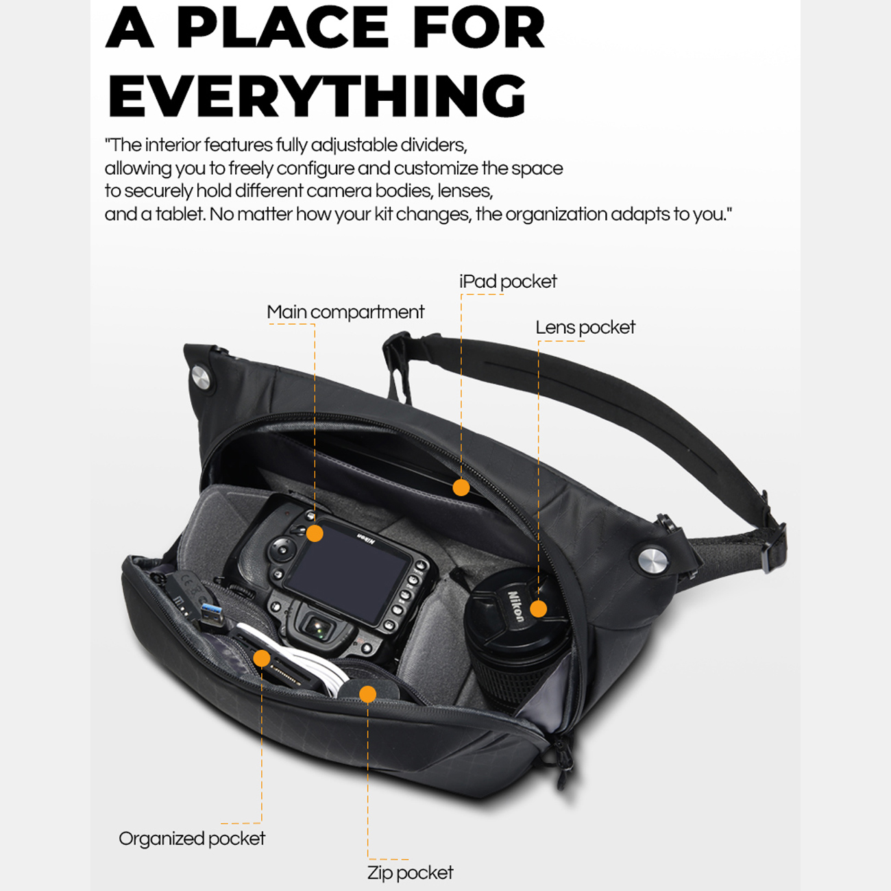 فضای داخلی کیف کراسبادی BANGE XJ-328 به پانلهای چسبی قلابوحلقه (Hook & Loop) مجهز شده که بهسادگی قابل جابجایی و تنظیم هستند. این دیوایدرها به شما اجازه میدهند چیدمان داخلی را دقیقاً مطابق با تجهیزات خود تغییر دهید. بدنه دوربین، لنزها، باتری یدک و سایر لوازم جانبی، هرکدام جای مشخص و امنی خواهند داشت.