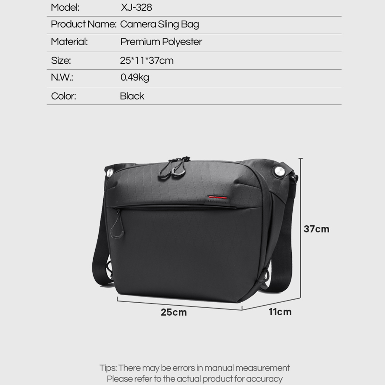 کیف شانهای دوربین بنج مدل XJ-328 با ابعاد **25 × 11 × 37 سانتیمتر** طراحی شده و فضای کافی برای نگهداری دوربین، لنزها، باتری یدک و لوازم جانبی را بدون ایجاد حجم اضافی فراهم میکند. وزن خالص 490 گرم، حمل این کیف را برای استفاده روزانه یا سفرهای کوتاه کاملاً راحت میسازد و فشار قابل توجهی به شانه وارد نمیکند. این تناسب ایدهآل بین وزن و ابعاد، XJ-328 را به انتخابی مناسب برای عکاسان شهری و طبیعتگردان تبدیل کرده است.