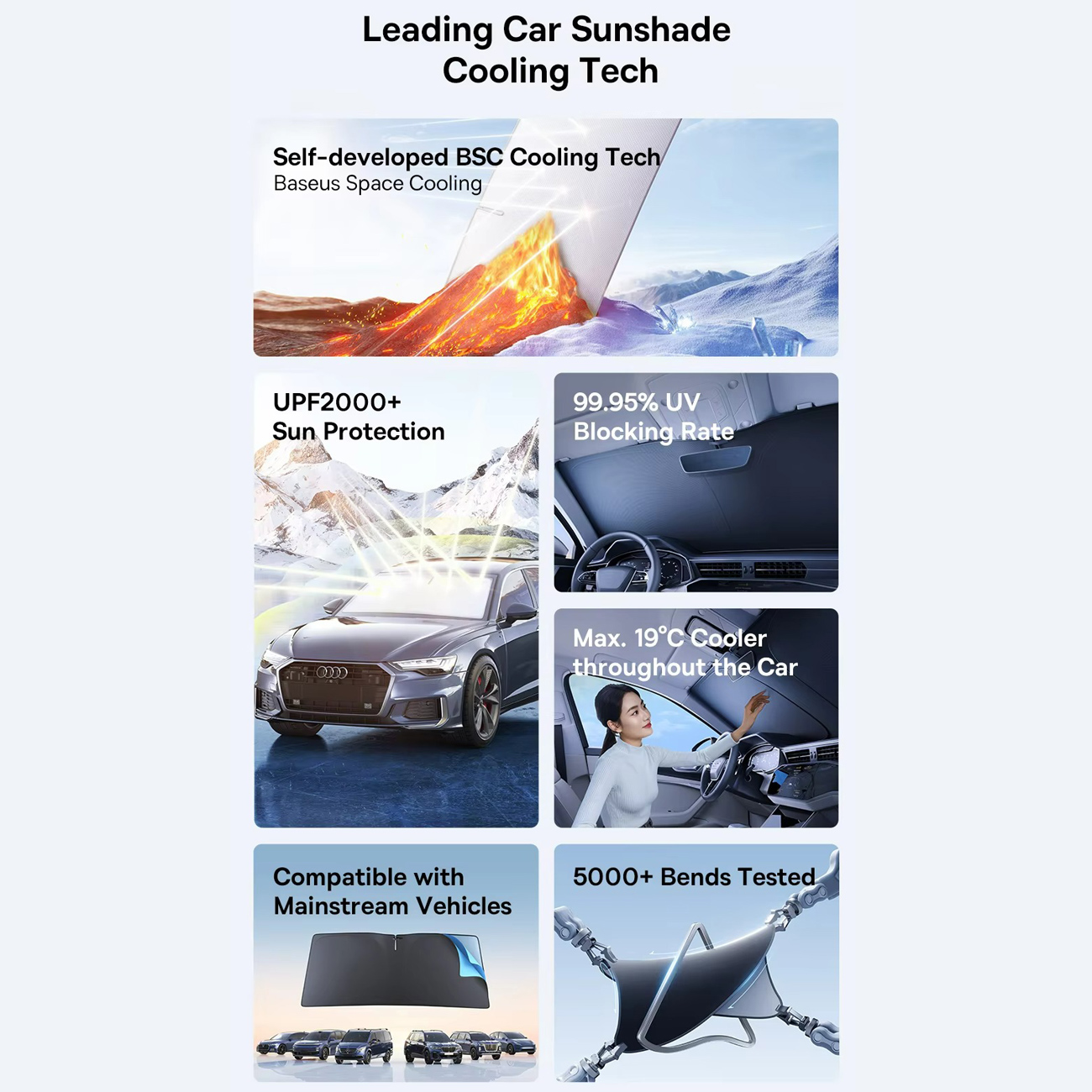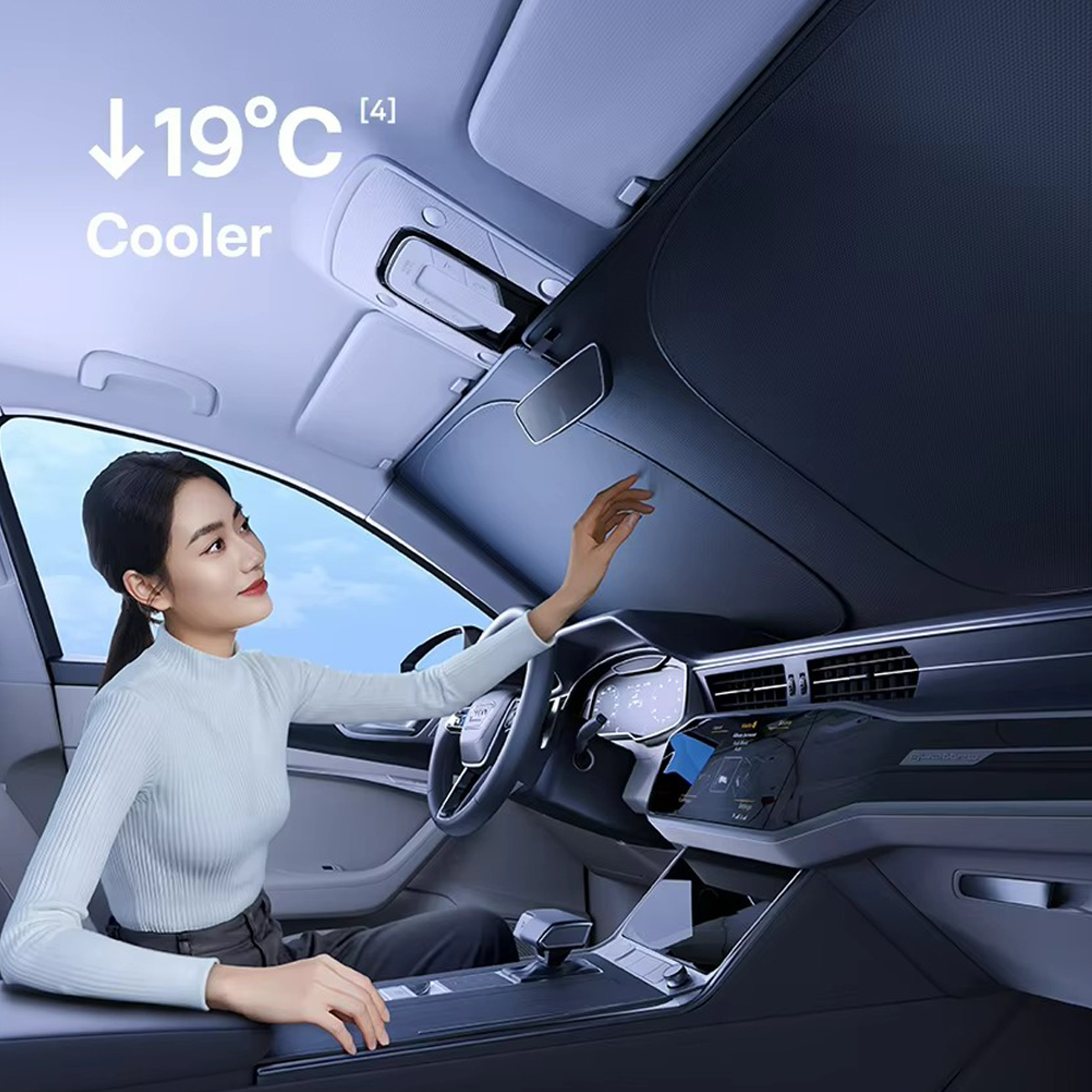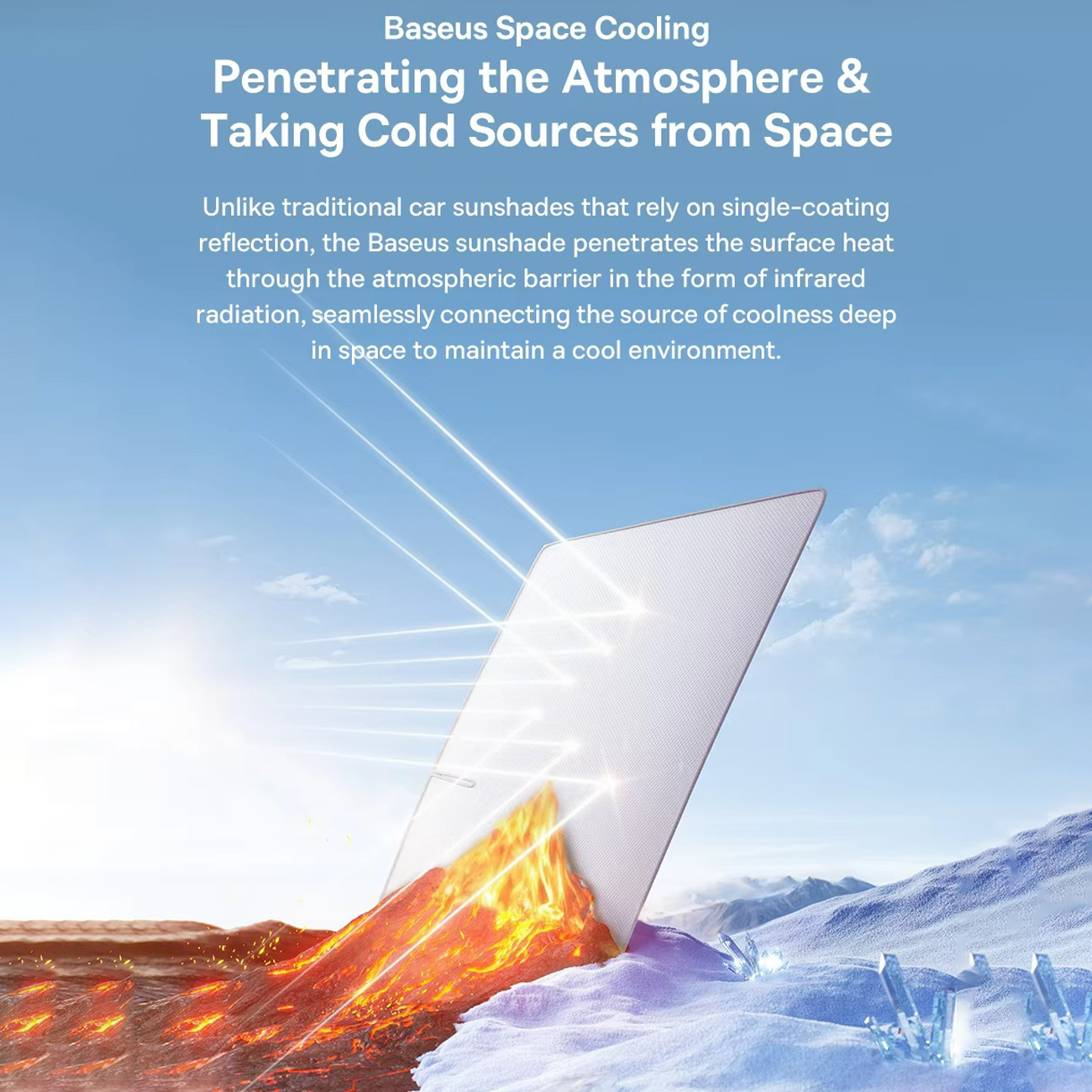 آفتابگیر شیشه جلو Baseus با استفاده از فناوری اختصاصی خنککننده فضایی بیسوس و تکنولوژی BSC، حرارت سطح شیشه را مستقیماً از طریق تابش مادون قرمز دفع میکند. این فرآیند بدون نیاز به سیستمهای برقی یا تجهیزات جانبی، دمای داخل خودرو را بهطور مؤثر کاهش داده و فضایی خنک و مطبوع ایجاد میکند.