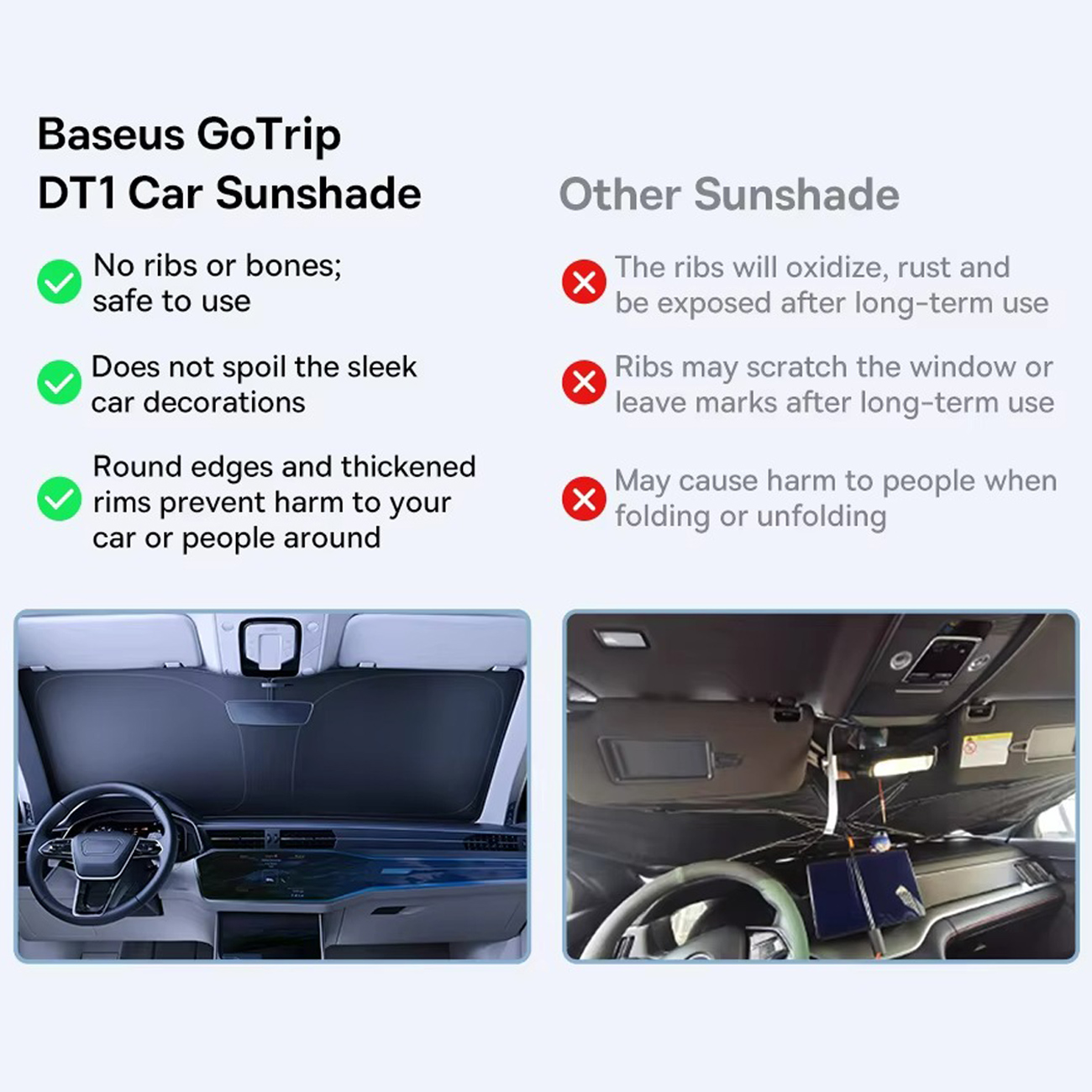 ساختار بدون تیغه و لبههای انعطافپذیر آفتابگیر تاشو بیسوس، نصب آسان و ایمن را تضمین میکند. این طراحی باعث میشود سایهبان بهطور کامل روی شیشه جلو قرار گیرد و از نفوذ نور خورشید یا ایجاد آسیب به شیشه و بدنه خودرو جلوگیری شود.