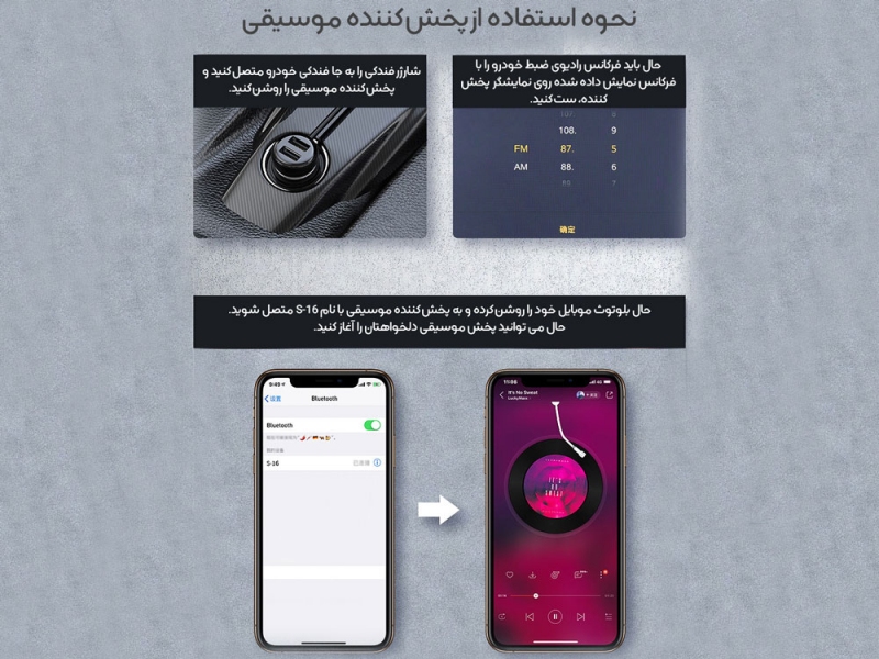 جذابترین ویژگی T Type S16، پخش موسیقی بیسیم از طریق بلوتوث 5.0 (تا 10 متری) است. فرکانس FM را روی رادیو خودرو ست کنید و موسیقی را از گوشی پخش نمایید—صدایی واضح و Hi-Fi بدون نویز. پشتیبانی از کارت حافظه TF (تا 32GB) و جک 3.5 میلیمتری AUX، پخش از فلش یا اتصال مستقیم به ضبط را ممکن میسازد. برای تماسها، میکروفون داخلی اجازه پاسخدهی با دکمه سبز (پخش) و نگهداشتن برای قطع را میدهد—رانندگی ایمنتر بدون جدا کردن دست از فرمان. حتی میتوانید دو موبایل را همزمان متصل کنید و تماسها را مدیریت نمایید.