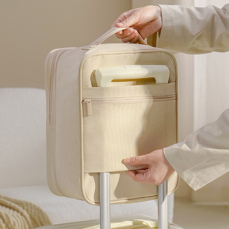 جیب پشتی لغزنده، کیف رو روی دسته چمدان فیکس میکنه—حمل بدون دست اضافی. محفظه زیپدار کوچک در پشت، اقلام دمدستی مثل کلید یا شارژر رو جا میده و Large رو به کیفی همهکاره بدل کرده.