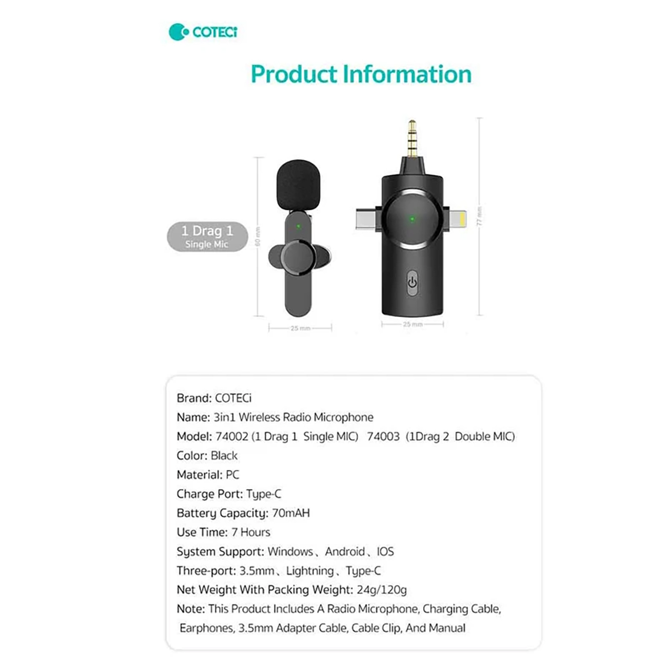 میکروفون یقهای وایرلس کوتسی مدل 74002؛ صدای شفاف و بیسیم برای تولید محتوا