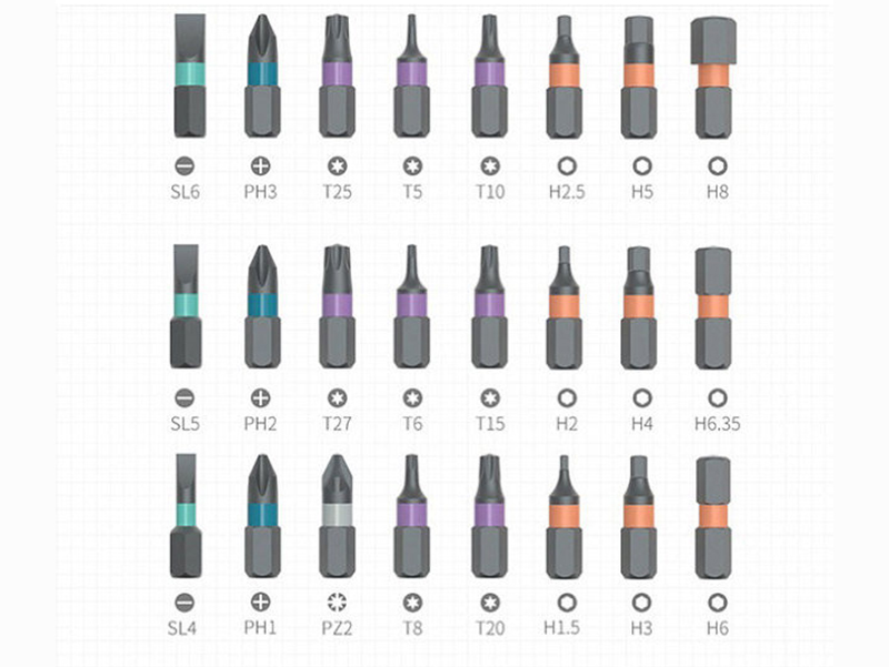 سرهای قابل تعویض: شامل ۲۴ سری مختلف در ۵ دستهبندی متنوع (پیچگوشتی تخت، چهارسو، ستارهای، مخصوص و غیره)