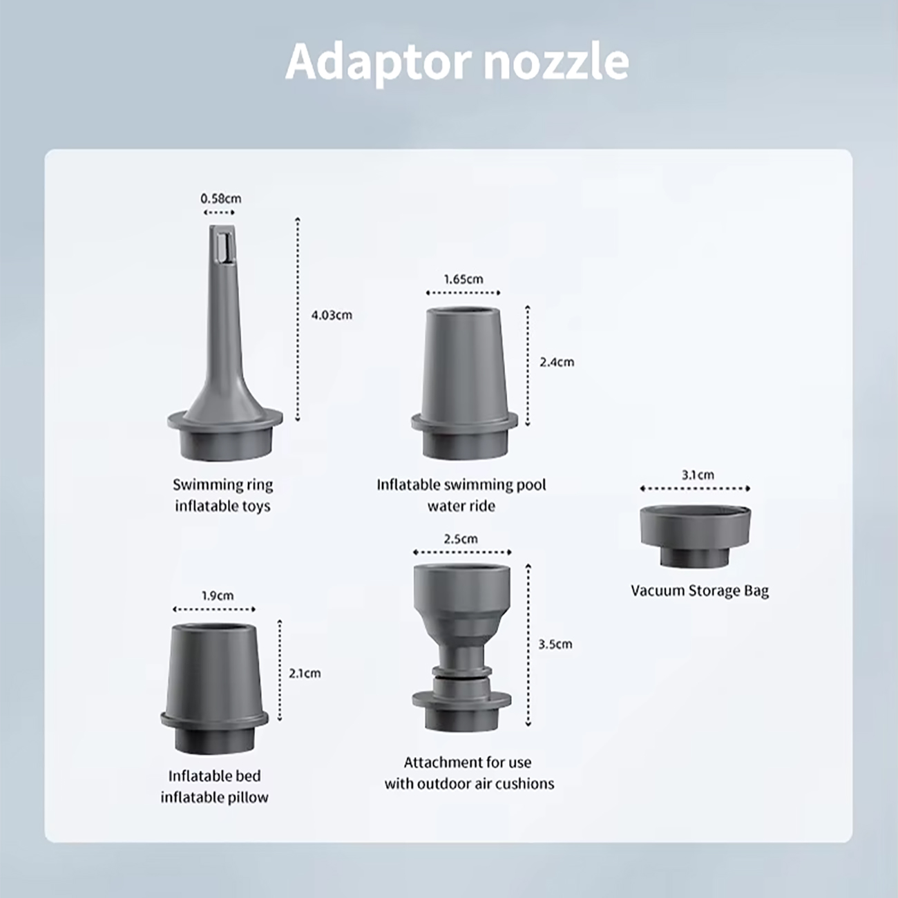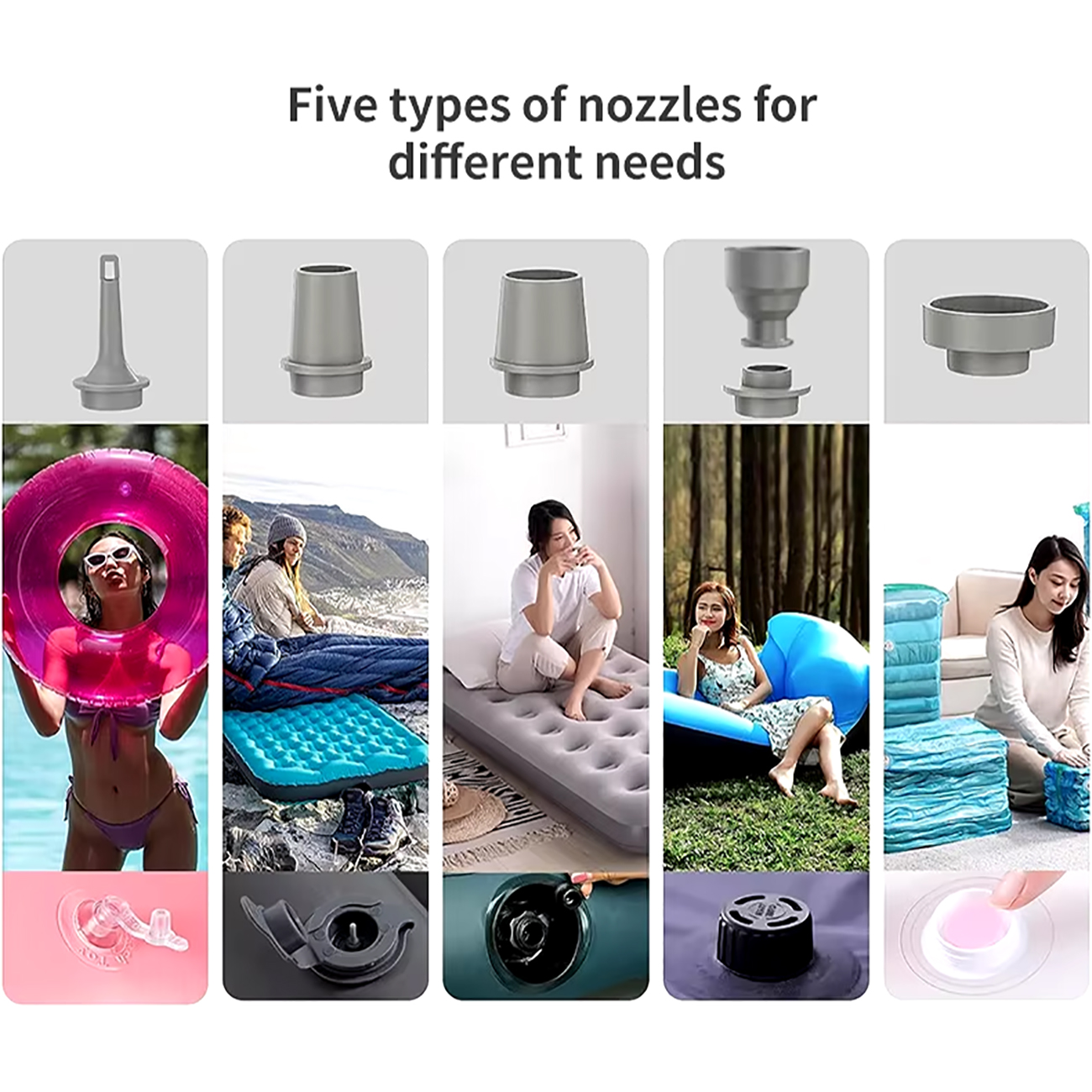 با 5 نازل مختلف، 66001 برای سایزهای کوچک بادی مناسبه: تشک بادی، تخت شنا، قایق بادی یا کیسههای وکیوم. سری وکیوم برای بستهبندی فشرده، و نازلهای باد برای وسایل مختلف. توجه: برای بادکنک، توپهای بزرگ یا لاستیک خودرو مناسب نیست—برای وسایل کوچک بادی طراحی شده.