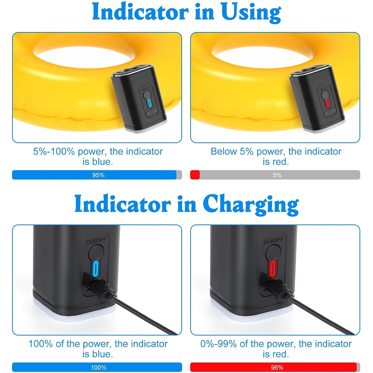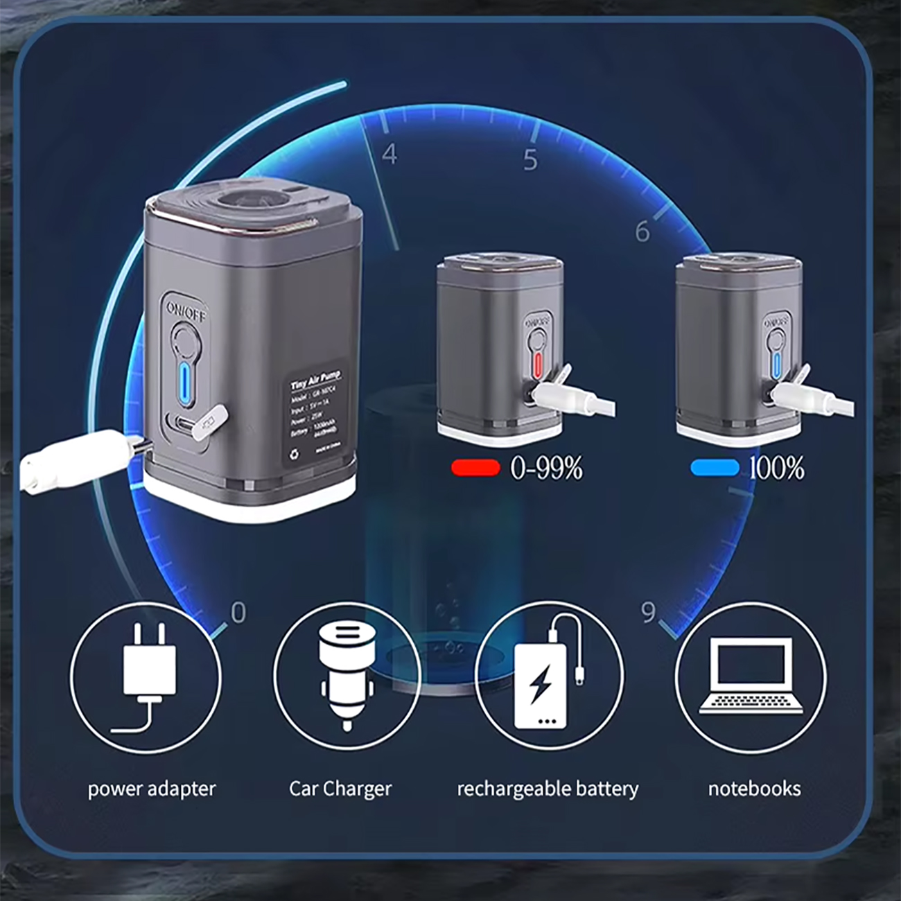 باتری 1200 میلیآمپرساعتی با ورودی 5V/1A، تا 25 دقیقه باد کردن مداوم رو ارائه میده. پورت Type-C (با کابل USB همراه)، شارژ رو با پاوربانک، لپتاپ یا فندکی آسون میکنه. چراغ نشانگر (قرمز برای شارژ، آبی برای فول)، وضعیت رو لحظهای نشون میده و 66001 رو همیشه آماده نگه میداره.