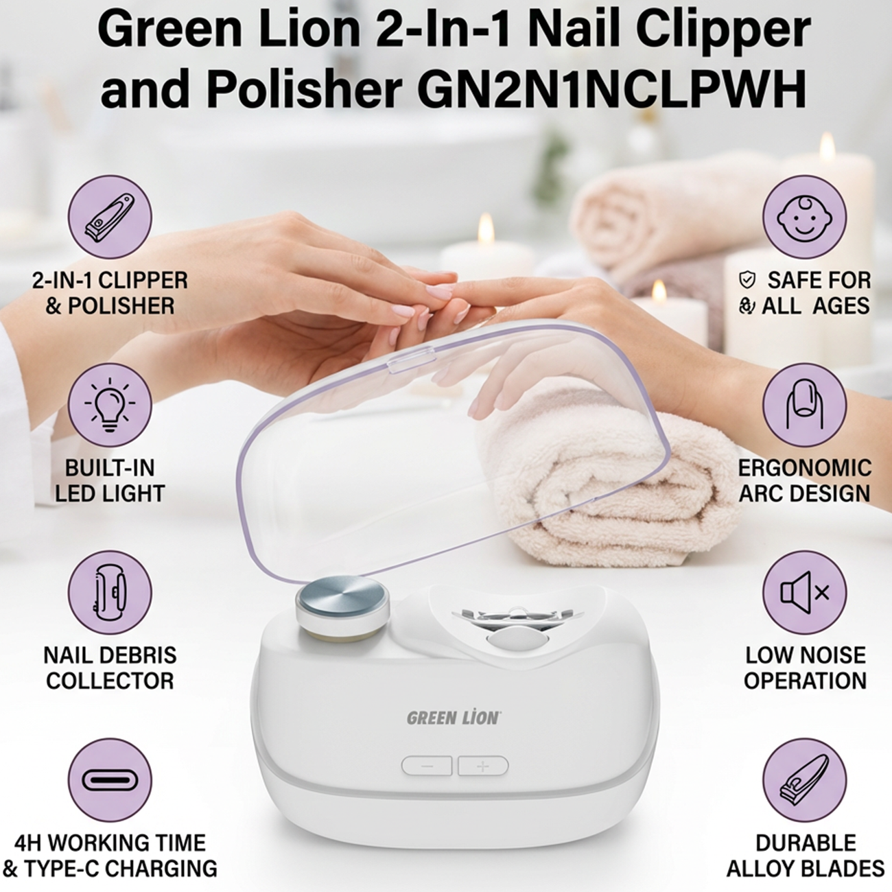 ناخنگیر و سوهان شارژی Green Lion مدل GN2N1NCLPWH یکی از جدیدترین و پیشرفتهترین ابزارهای مراقبت شخصی است که با طراحی هوشمندانه خود، تجربهای ایمن و متفاوت از کوتاه کردن ناخن ارائه میدهد. این دستگاه با ترکیب دو عملکرد ضروری کوتاهکردن ناخن و سوهانکشی در یک بدنه جمعوجور، شما را از استفاده ابزارهای جانبی بینیاز میکند.