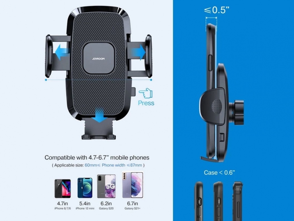 هولدر JR-ZS259 با چسب قوی به سطح داشبورد یا شیشه میچسبد و سه گیره مثلثی، گوشی را از سه طرف احاطه میکنند. این طراحی، حتی در جادههای ناهموار، دستاندازها یا ترمزهای ناگهانی، بدون لرزش یا افتادن عمل میکند. دکمه تنظیم اندازه در کنار بدنه، گیره را برای سایزهای مختلف (4.7 تا 6.7 اینچ) باز و بسته میکند و پدهای ضدلغزش، ثبات را تضمین مینمایند.