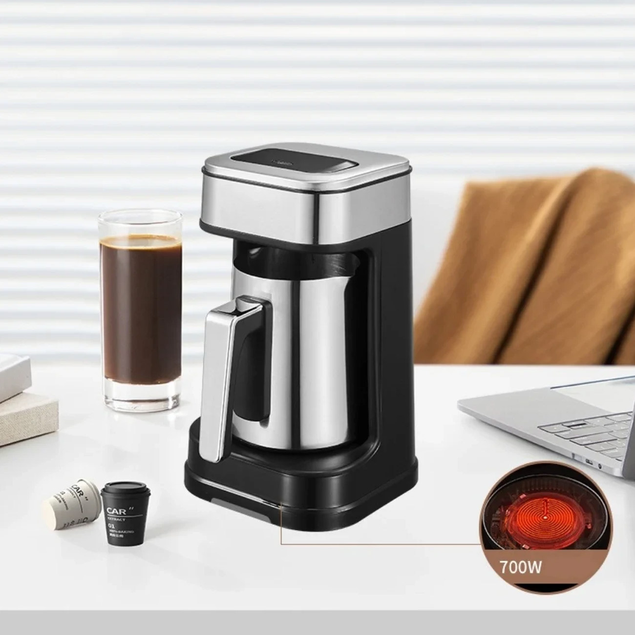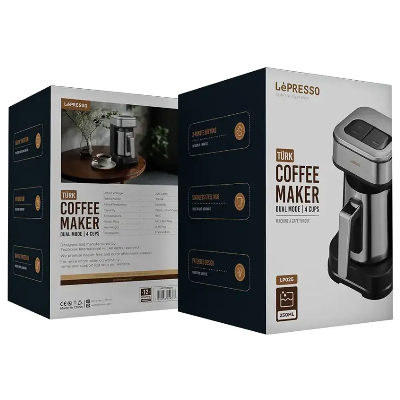 کامل و آماده به کار: این دستگاه با لیوان استیل ضدزنگ عرضه میشود که همرنگ بدنه است و به حفظ گرمای نوشیدنی کمک میکند. دوشاخه آن از نوع UK (سهپین) است و به راحتی با استفاده از یک تبدیل استاندارد قابل استفاده میباشد.