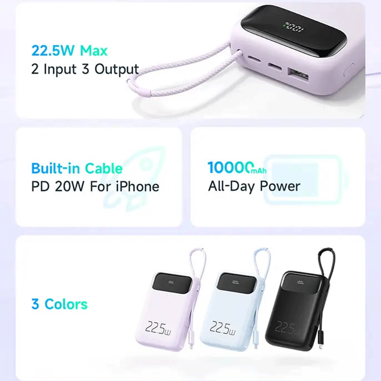پاوربانک MCDODO مدل MC-325 با طراحی ساده و در عین حال هوشمندانه خود، قابلیتهای متعددی را در اختیار کاربران قرار میدهد. بدنه این پاوربانک از ترکیب پلیکربنات نسوز و پلاستیک ABS باکیفیت در رنگهای مشکی، آبی و یاسی ساخته شده و از یک باتری با ظرفیت ۱۰۰۰۰ میلیآمپر ساعت بهره میبرد. این دستگاه دارای سه پورت (دو درگاه ورودی و دو درگاه خروجی) با توان ترکیبی ۲۲.۵ وات است.