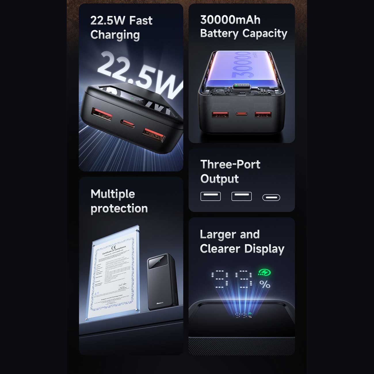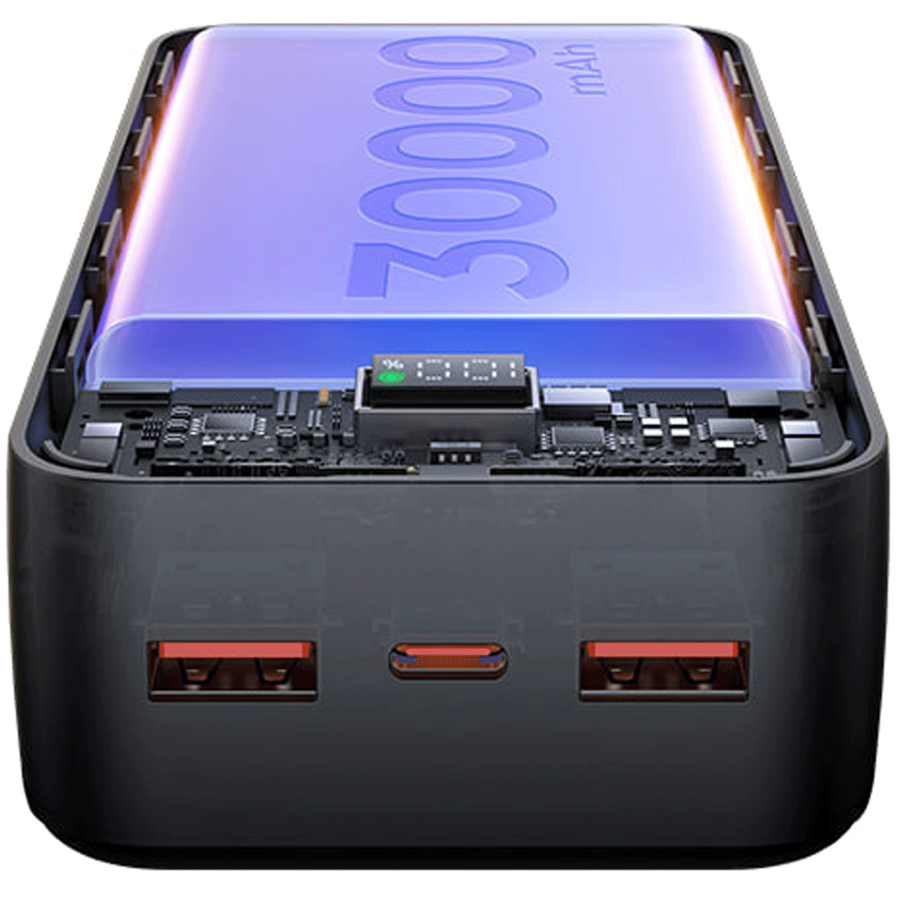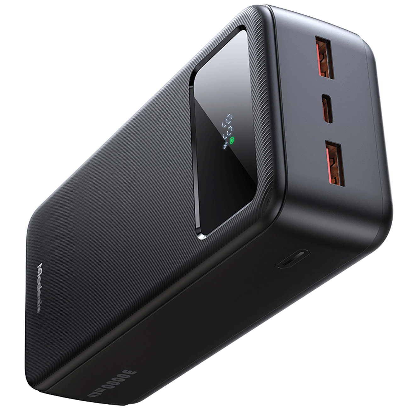 این پاوربانک مجهز به یک صفحه نمایشگر LED با رنگ مشکی در قسمت بالایی بدنه است که به شما امکان میدهد درصد دقیق شارژ باقیمانده را به صورت آنی مشاهده نمایید و همیشه از وضعیت انرژی ذخیرهشده مطلع باشید.