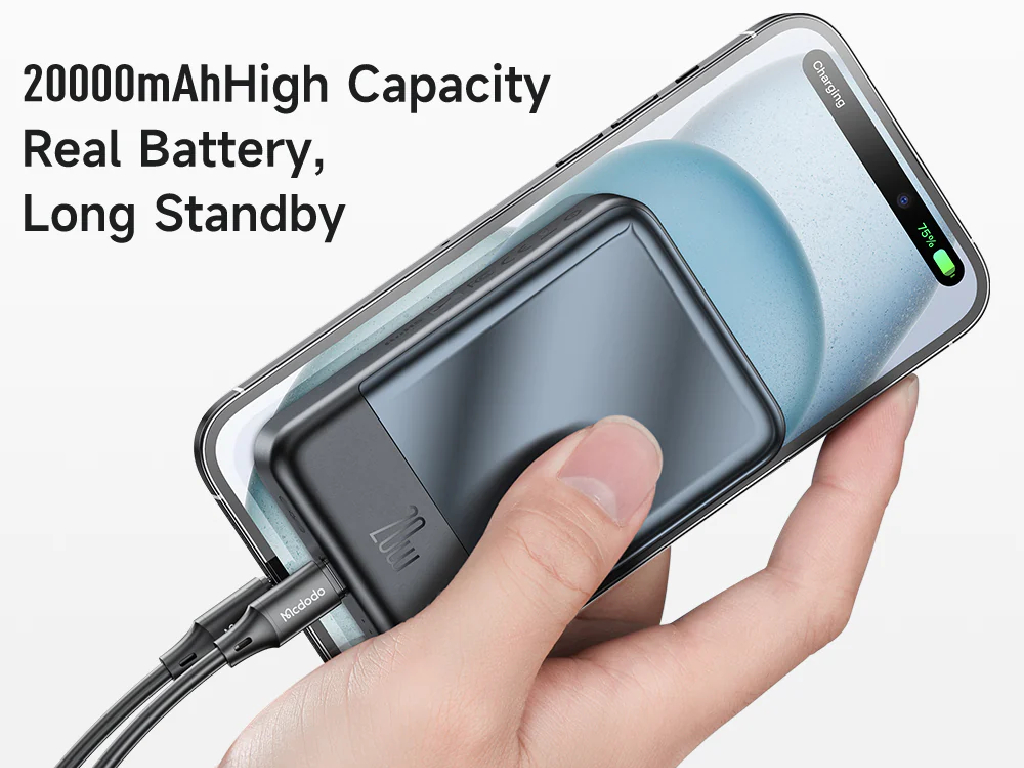 باتری این دستگاه از نوع لیتیوم پلیمری با ظرفیت اسمی ۲۰۰۰۰ میلیآمپر ساعت است. این ظرفیت قابل توجه به عنوان مثال توانایی شارژ کامل گوشی iPhone 13 Mini تا approximately ۵ بار و شارژ کامل آیفون ۱۴ تا approximately ۴ بار را دارد. این ویژگی آرامش خاطر کامل را در طول سفرهای طولانی یا روزهای پرمشغله برای شما به ارمغان میآورد.
