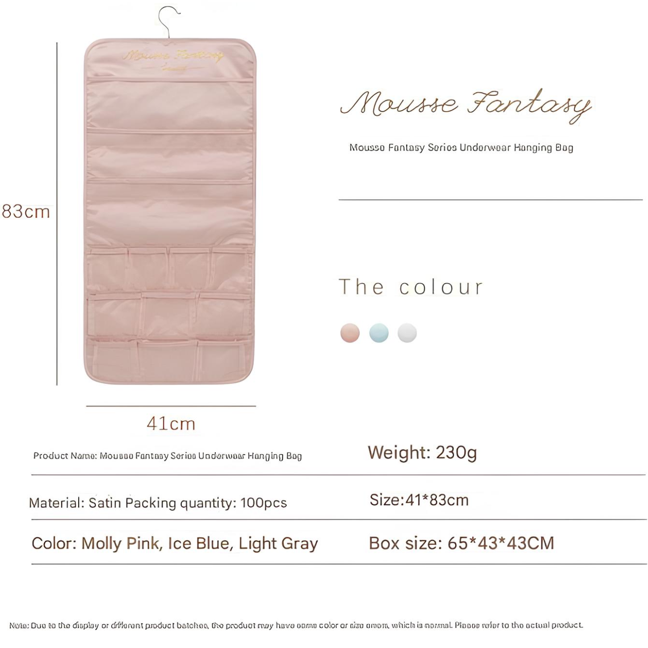 آویز جا جورابی، لباس زیر و وسایل داخل کمد مدل Mousse Fantasy با ساتن نرم، جیبهای دوطرفه، قلاب 360 درجه و شستشوی آسان، انتخابی هوشمند برای نظم، زیبایی و بهداشت کمده. این کاور سبک (230 گرم) با ظرفیت بالا، روتینتون رو ساده میکنه و استایلتون رو حفظ میکنه.