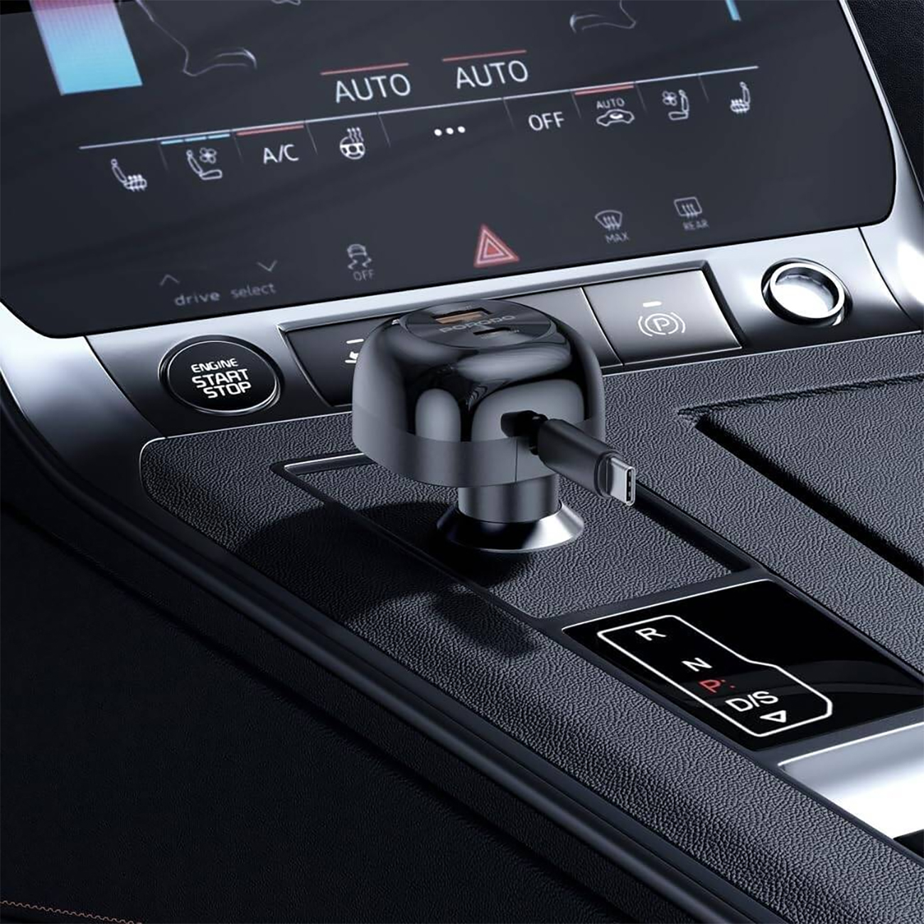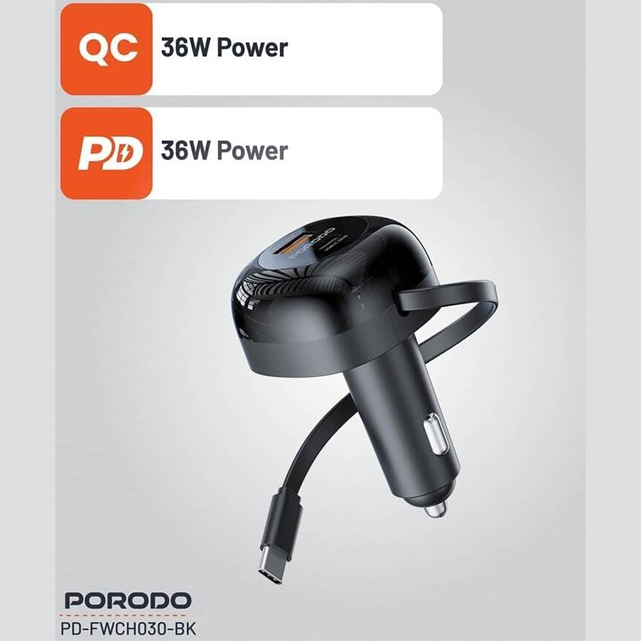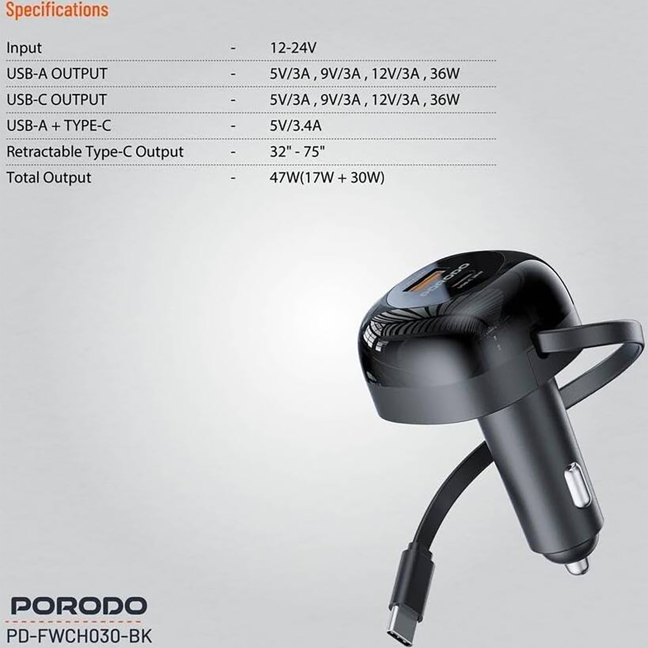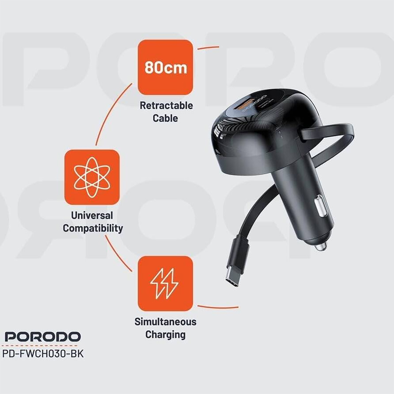 Porodo Dual Port Car Charger 80cm Retractable Type-C Cable