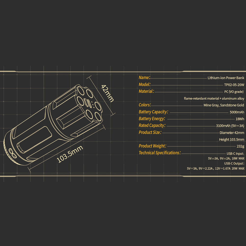 بدنه این پاوربانک از آلیاژ آلومینیوم با برش CNC ساخته شده که علاوه بر ظاهری مدرن، در برابر ضربه و خش مقاوم است. این جنس با دفع موثر گرما، ایمنی و دوام دستگاه را تضمین میکند. با وزن 232 گرم، قطر 42 میلیمتر و ارتفاع 103.5 میلیمتر، TP02-05 خوشدست و قابل حمل بوده و برای استفاده روزمره، سفر یا محیطهای کاری مناسب است.