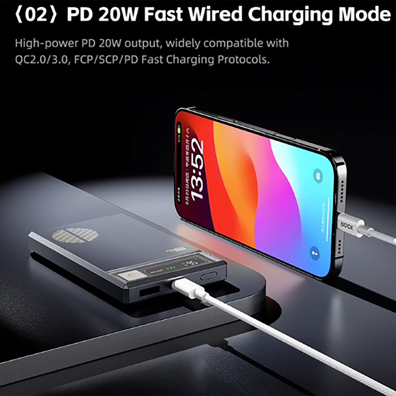 پاوربانک مغناطیسی راک مدل PBW117-B با طراحی رترو و شیک، ابعاد جمعوجور و وزن سبک، گزینهای بسیار مناسب برای سفر محسوب میشود. ظرفیت بالای باتری آن امکان شارژ چندباره گوشی و سایر گجتها را در طول سفر فراهم میسازد و پشتیبانی از شارژ سریع PD 20W، زمان شارژ را به طور قابل توجهی کاهش میدهد.
