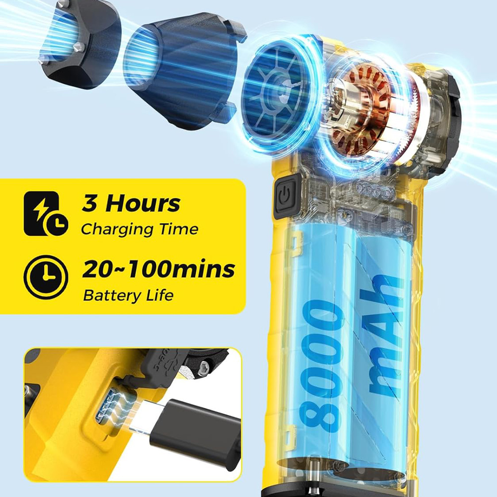 باتری 8000 میلیآمپرساعتی (2 × 4000mAh)، تا 100 دقیقه باد مداوم میده—کافی برای تمیزکاری کامل یا کمپینگ. شارژ Type-C، زمان آمادهباش رو کم میکنه و FSB20 رو همیشه در دسترس نگه میداره.