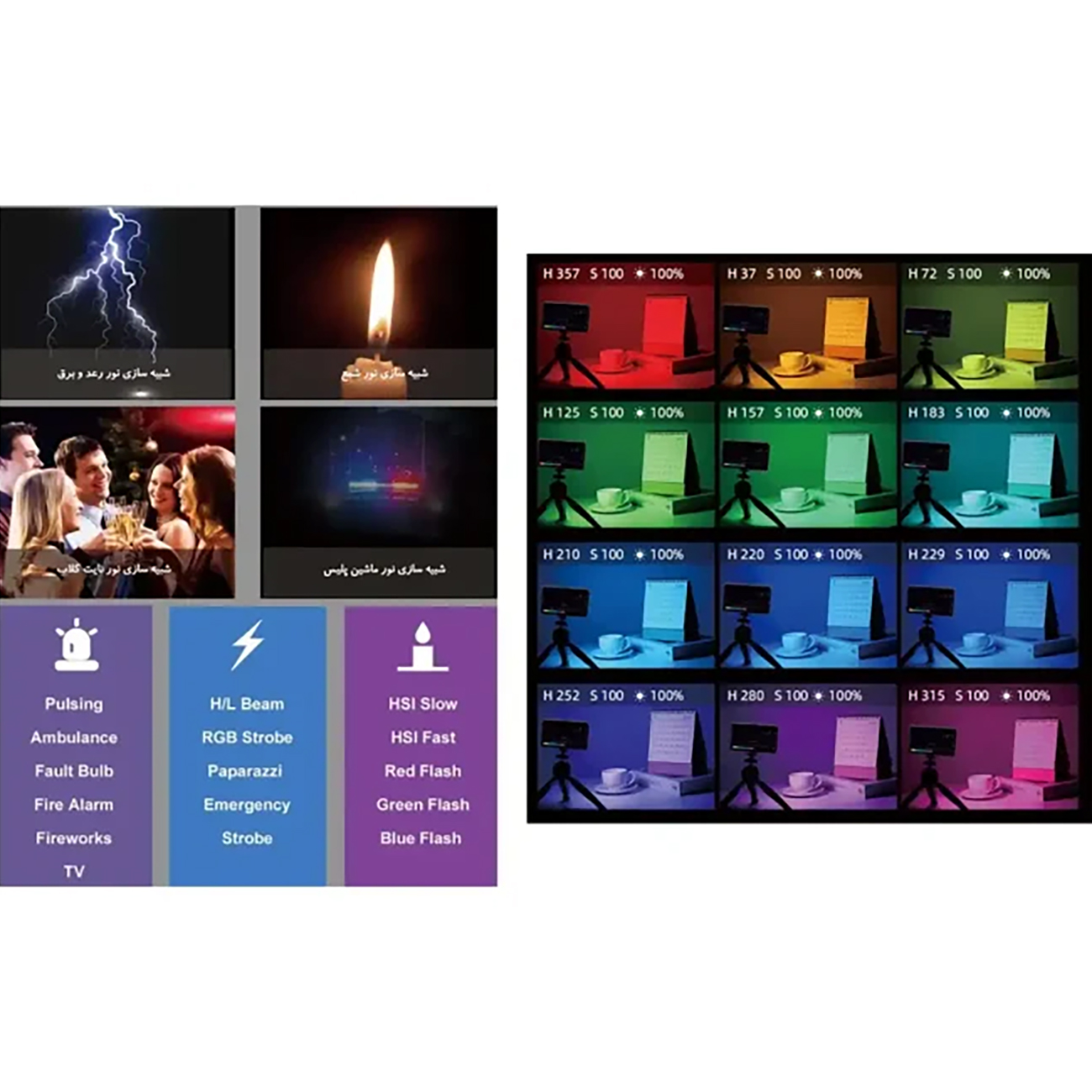 این پنل نور با دارا بودن ۱۴۰ چراغ LED (متشکل از ۴۹ چراغ سفید، ۴۹ چراغ زرد و ۴۲ چراغ RGB)، یک پکیج حرفهای و همهکاره به شمار میرود. این ترکیب منحصربهفرد، امکان تنظیم دقیق hue رنگ، تغییر دمای رنگ از گرمای ۲۵۰۰K تا سرمای ۹۰۰۰K و خلق بینهایت جلوه نوری و رنگی را برای شما فراهم میکند.