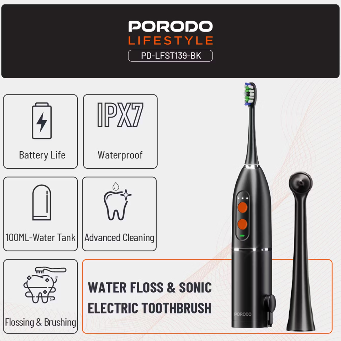 Porodo LFS13 Water Floss & Sonic Electric Toothbrush PD- LFST139-BK / PD-LFST139-WH