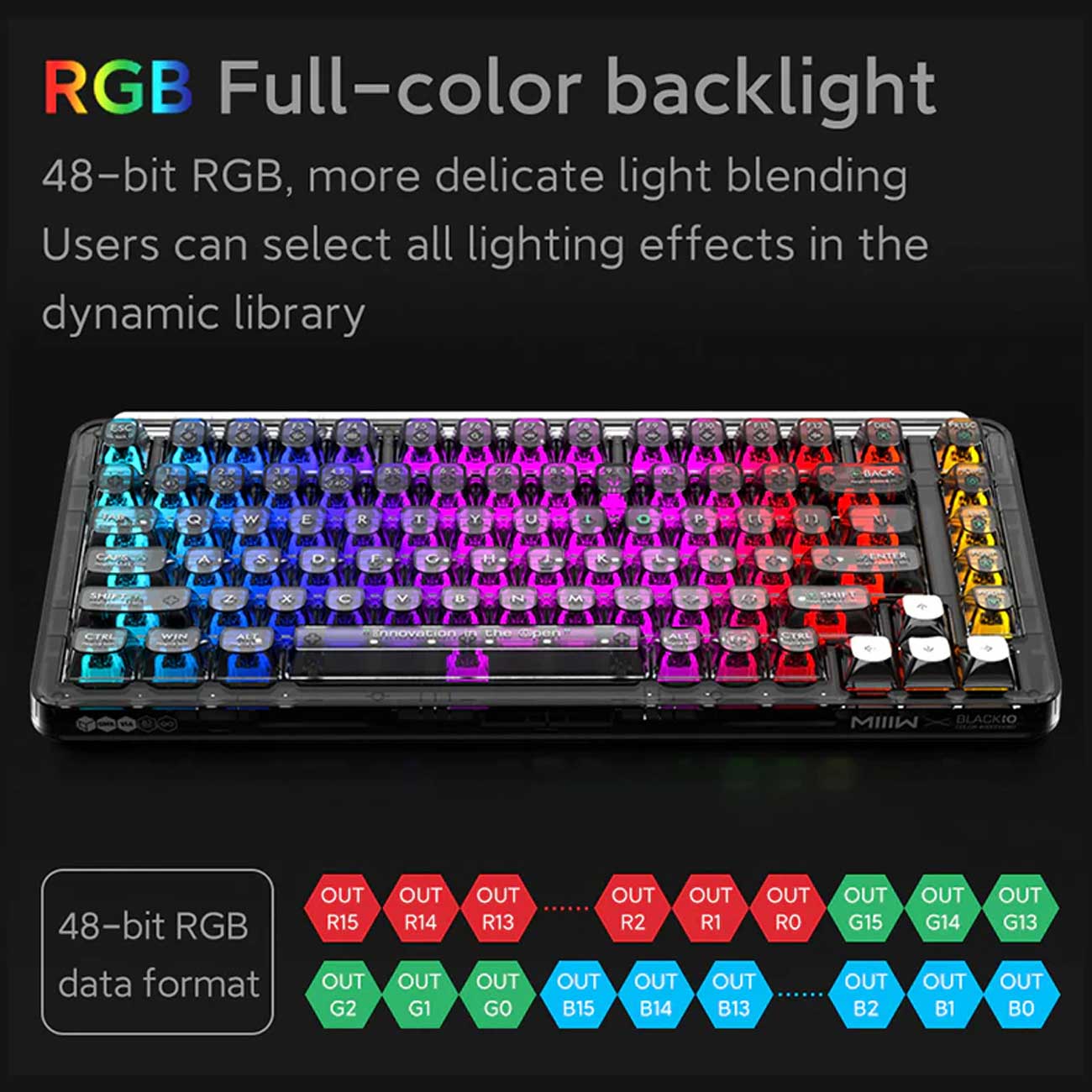 کیبورد MIIIW BLACK IO با نورپردازی RGB و 43 افکت نوری از پیشتنظیمشده، فضایی جذاب و پویا روی دسکتاپ شما خلق میکند. بدنه نیمهشفاف مشکی در کنار این نورپردازی، ظاهری مدرن و چشمنواز ارائه میدهد. افکتهای نوری از طریق نرمافزار اختصاصی قابل تنظیم هستند تا با استایل شما هماهنگ شوند.