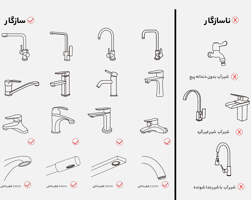 سازگاری بالا: قابلیت نصب روی شیرآبهایی با قطر داخلی ۱۹ تا ۲۴ میلیمتر را دارد و با طیف وسیعی از شیرآبها سازگار است.