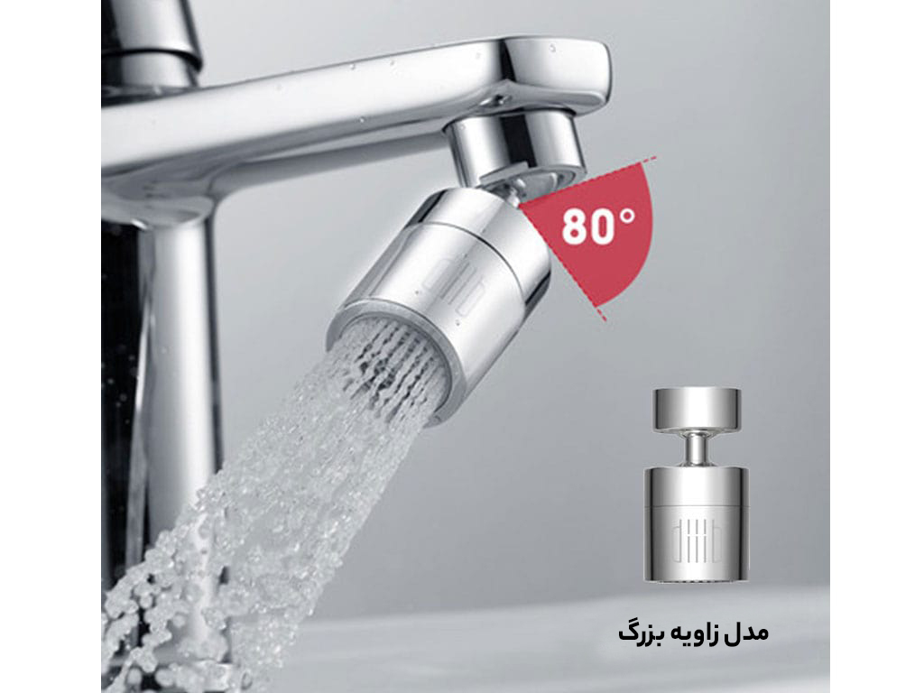 مزیت و کاربرد: با پوشش زاویه بیشتر، برای شیرآبهای آشپزخانه و حمام که ارتفاع مناسبی از سینک دارند، مناسب است. این مدل قابلیت تغییر بین دو حالت پاشش آب را داراست. همراه با آداپتور ارائه میشود.