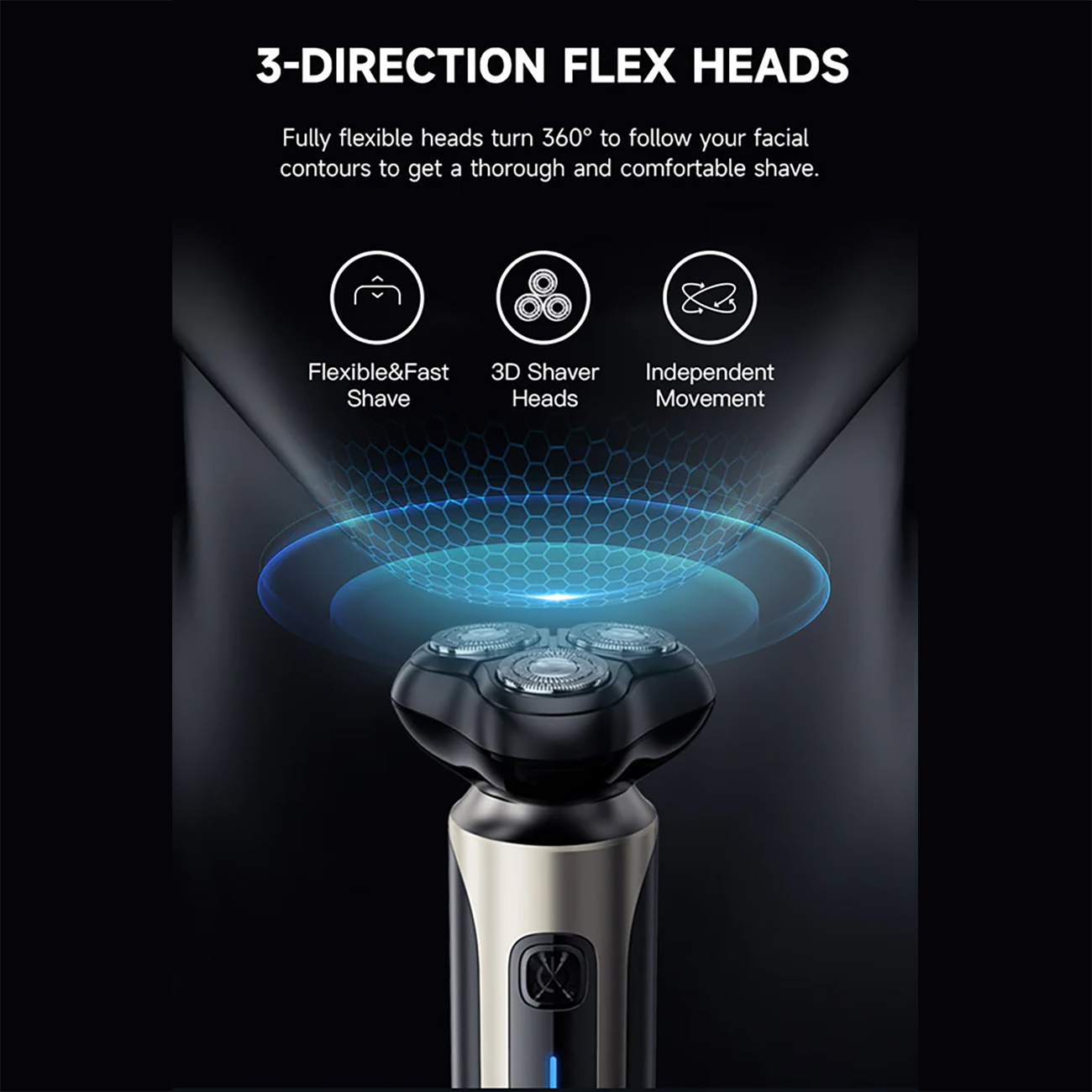 این ریشتراش مجهز به سه سر شناور و کاملاً منعطف است که تا ۳۶۰ درجه میچرخند و به هوشمندی با تمامی contours صورت، از جمله خط فک، گردن و حتی نقاط سخت مانند زیر بینی و اطراف چانه، تطبیق پیدا میکنند. این طراحی: