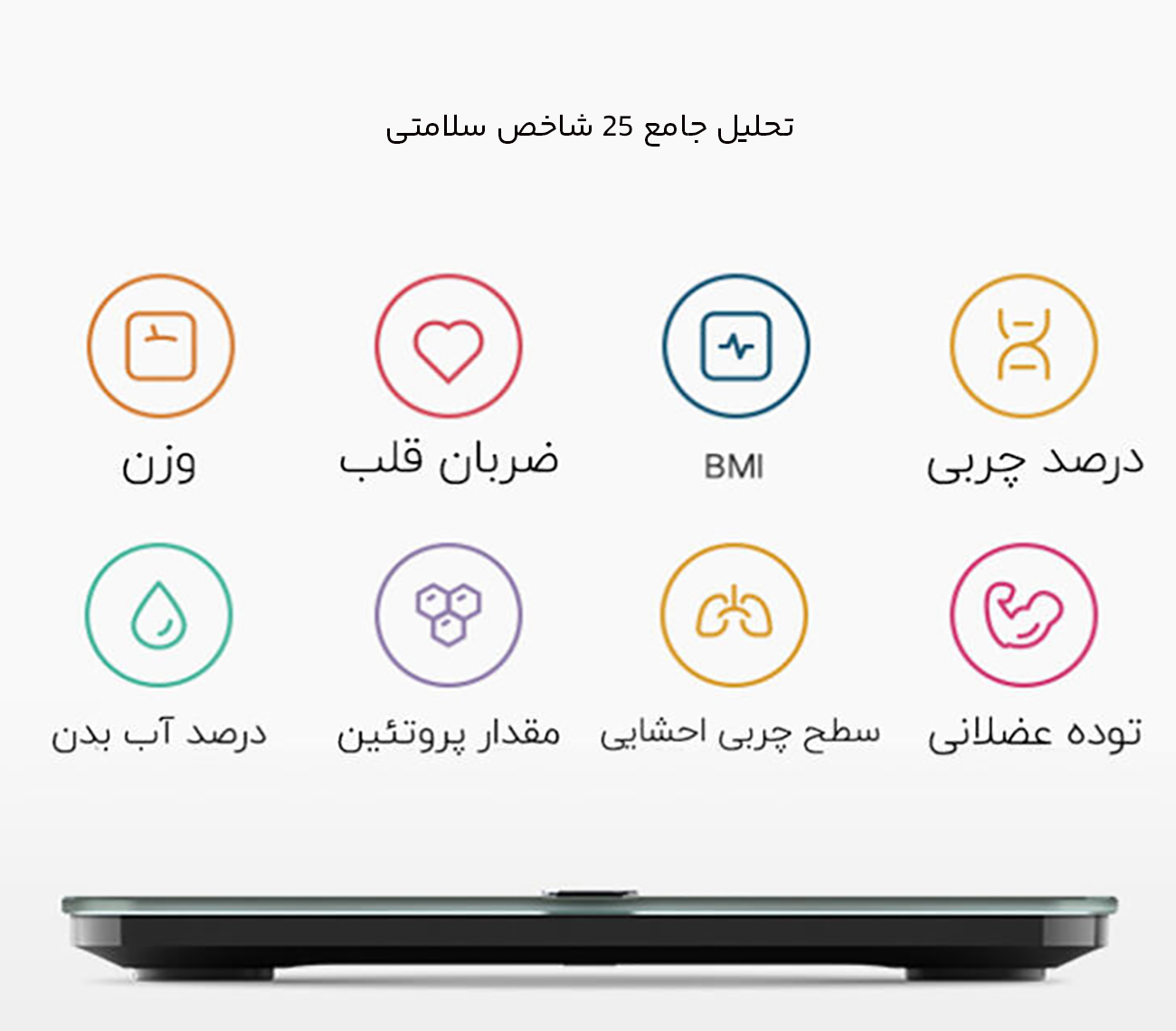 | شاخص های اندازه گیری | وزن، ضربان قلب، BMI، درصد چربی بدن، توده عضلانی، محتوای پروتئین، توده استخوان، چربی احشایی و موارد دیگر |