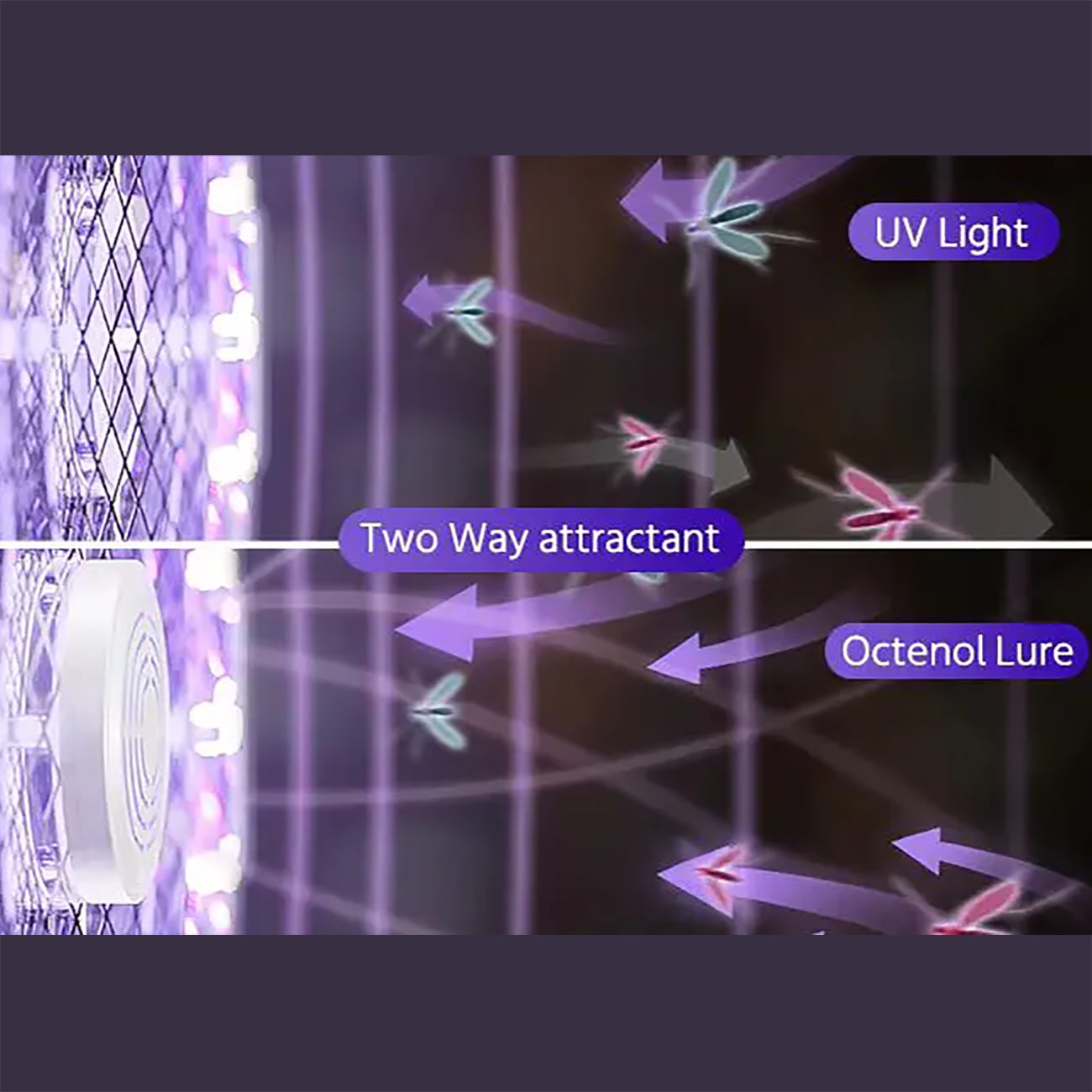 لامپهای فرابنفش با طول موج بهینه ۳۶۵ نانومتر در این دستگاه، همراه با یک جاذب پشه بیونیک، به طور هوشمندانهای پشهها و سایر حشرات پروازی را به دام میاندازند. این فناوری نه تنها جذبی مؤثر و کارآمد ارائه میدهد، بلکه مصرف انرژی بسیار پایینی نیز دارد. این روش که بر پایه فناوری بیونیک انسانی عمل میکند، کاملاً بدون استفاده از هرگونه ماده شیمیایی مضر است و ایمنی کامل را برای انسانها و حیوانات خانگی تضمین مینماید.