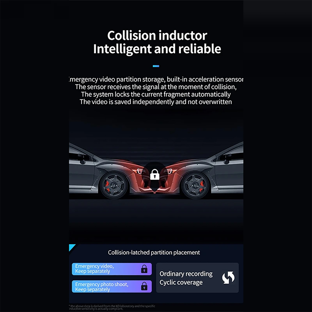 دوربین XJ03 از فناوری ضبط حلقه بدون درز پشتیبانی میکند، که با پر شدن ظرفیت کارت حافظه، قدیمیترین فیلمها را بازنویسی میکند تا ضبط بیوقفه ادامه یابد. سنسور G داخلی، برخوردهای ناگهانی یا ترمزهای شدید را تشخیص میدهد و فایل ویدیویی مرتبط را قفل میکند تا بهعنوان مدرک حفظ شود. این ویژگی در تصادفات یا حوادث جادهای، شواهد مهمی را برای مسائل حقوقی یا بیمهای فراهم میکند.