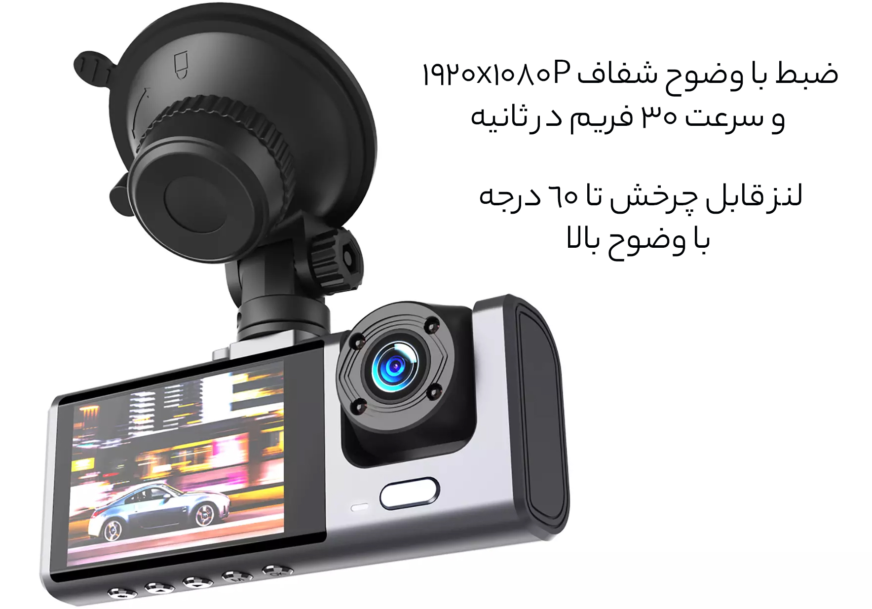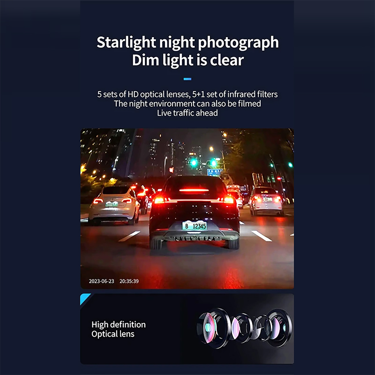 لنز این دوربین با زاویه دید 140 درجه و قابلیت چرخش انعطافپذیر، امکان ضبط نمای جلو و داخل کابین را فراهم میکند. همچنین، 5 مجموعه لنز اپتیکال HD با فیلتر مادون قرمز، ضبط باکیفیت در شب یا شرایط نور کم را ممکن میسازد، که برای رانندگی در تاریکی بسیار کاربردی است.