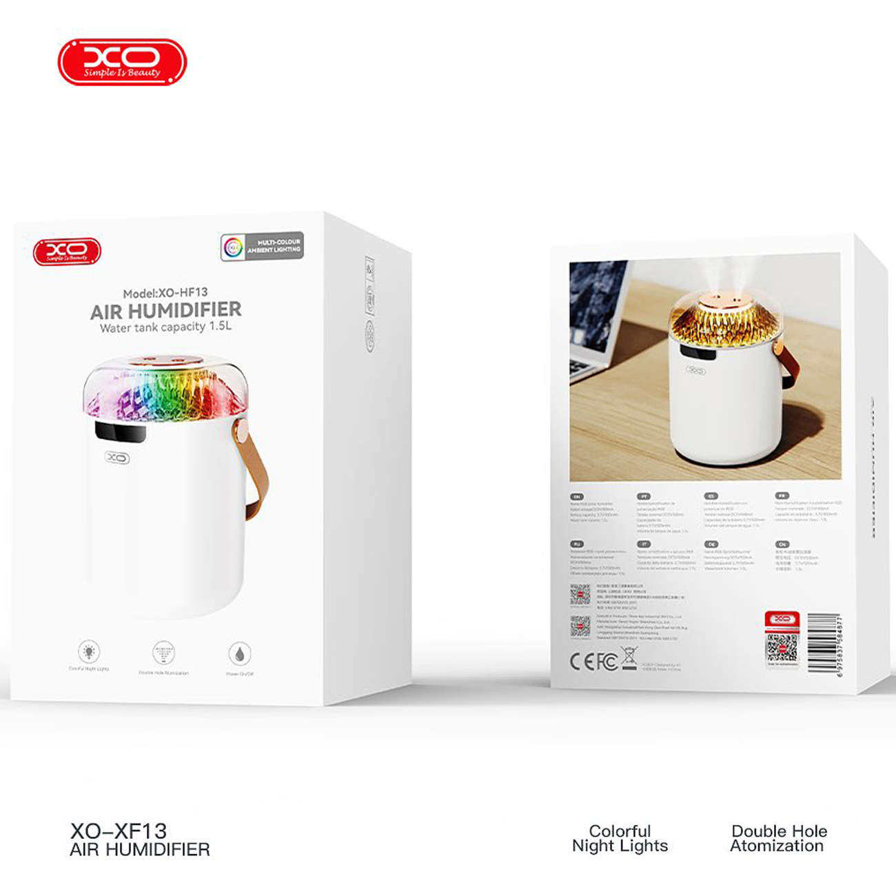 دستگاه بخور سرد XO-HF13 با ابعاد 129 × 129 × 184 میلیمتر و وزن 460 گرم، نمونه ای درخشان از طراحی مدرن و جمعوجور محسوب میشود. بدنه این محصول از مواد مقاوم PP و ABS ساخته شده که دوام و ماندگاری بالایی را تضمین میکند. طراحی سبک و فشرده آن این امکان را فراهم میسازد که به راحتی روی میز تحریر، میز کنار تخت یا هر فضای محدود دیگری قرار گیرد. رنگ سفید و ظاهر مینیمال آن به خوبی با انواع دکوراسیونهای داخلی هماهنگ میشود.