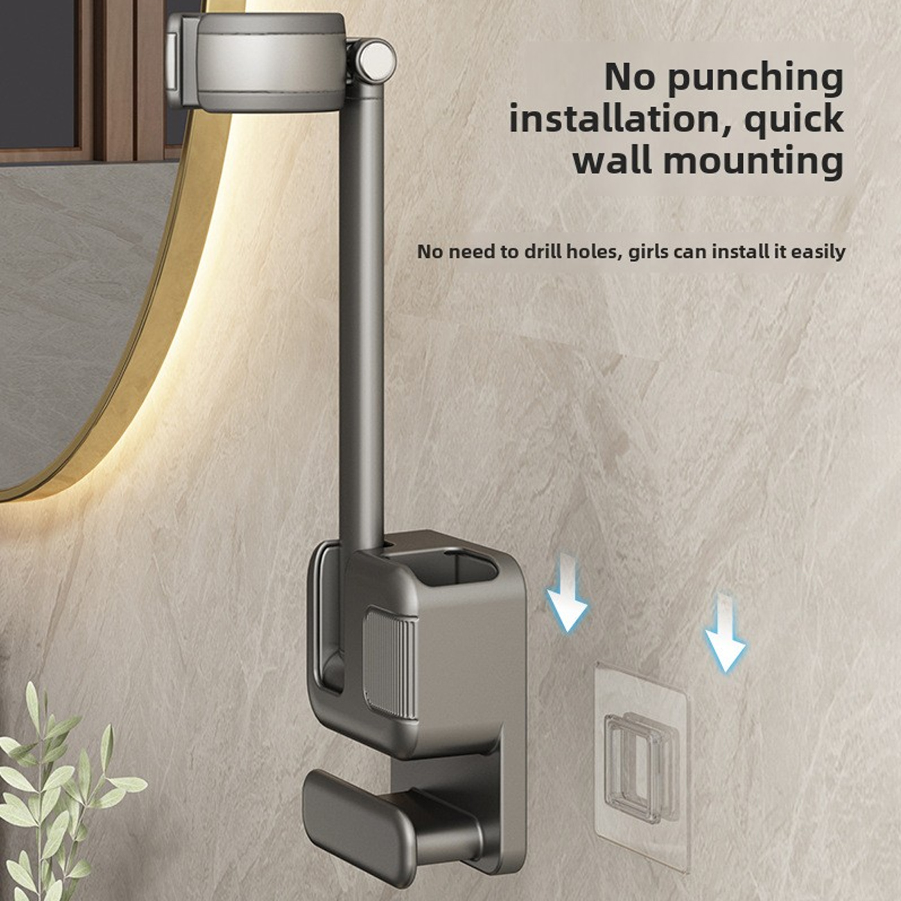 این نگهدارنده با بهرهگیری از یک چسب قدرتمند مخصوص نصب میشود و نیاز به دریل کاری یا ایجاد سوراخ بر روی دیوار را کاملاً مرتفع میسازد. این ویژگی باعث میشود حتی دیوارهای حساس و سطوح کاشیشده حمام نیز بدون آسیب باقی بمانند و فرآیند نصب، بسیار سریع و بیدردسر انجام شود. بدون نیاز به هیچ ابزار خاصی، میتوانید این استند را روی هر سطح صاف و مناسب قرار دهید و از راحتی استفاده روزانه آن بهرهمند شوید.