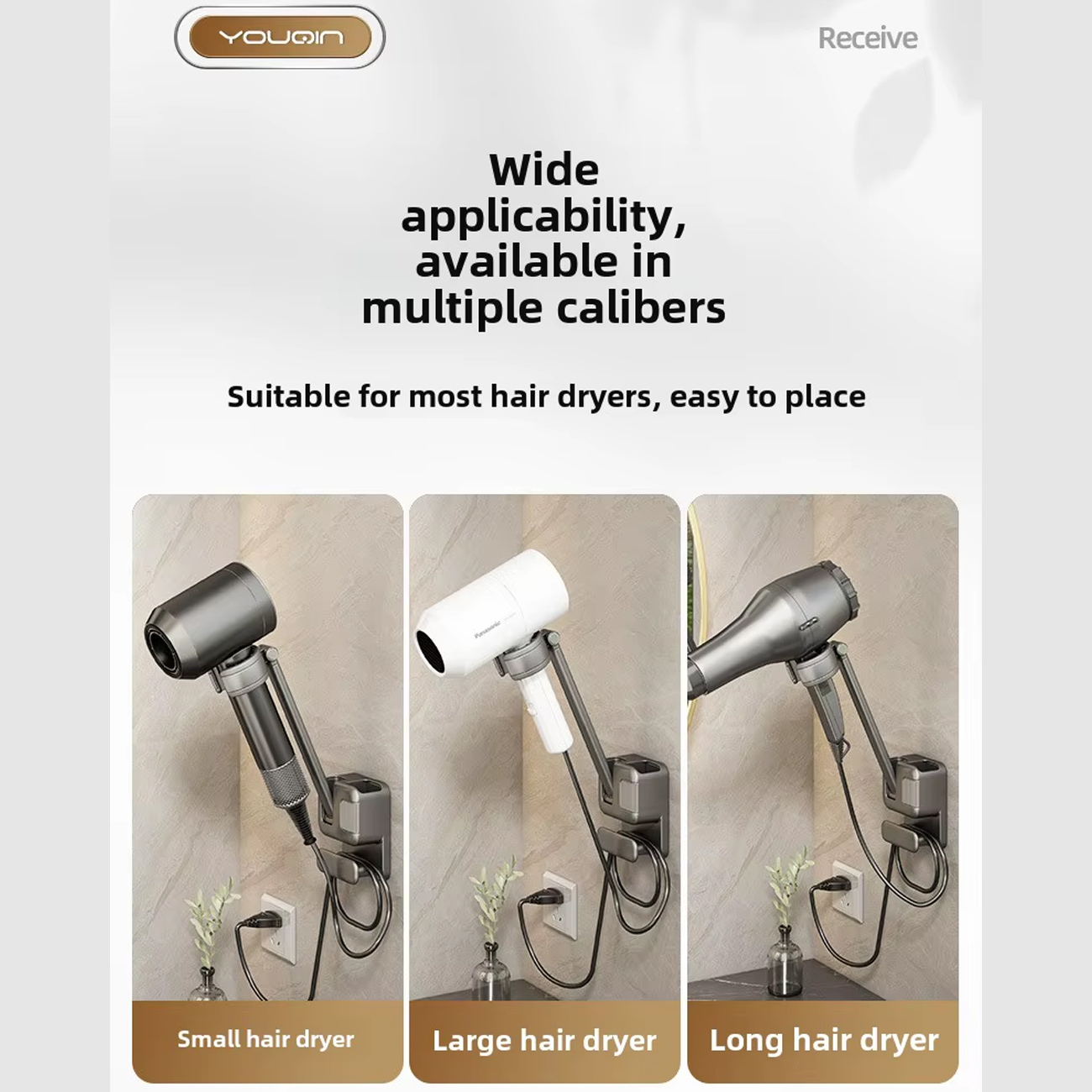 نگهدارنده سشوار YOUGIN با اکثر سشوارهای موجود در بازار، اعم از مدلهای کوچک، متوسط و بزرگ، سازگاری کامل دارد و قرار دادن و برداشتن سشوار در آن بسیار آسان است. طراحی هوشمند محصول تضمین میکند که سشوارها به طور ایمن در جای خود ثابت بمانند و خطر لغزش یا سقوط به حداقل برسد. این سازگاری گسترده، استفادهای امن و مطمئن را برای هر نوع سشوار خانگی یا حتی حرفهای ممکن میسازد.